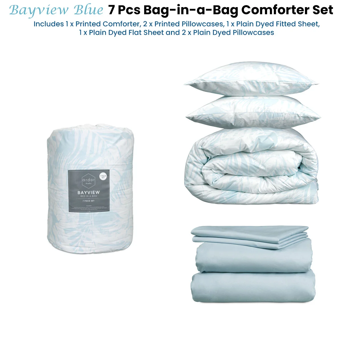 Our Bayview Blue 7 Pcs Bed-In-A-Bag Comforter Set with Sheet Set by Ardor features cool misty blues reminiscent of coastal getaways. The textured palm print design of the comforter and pillowcases will add subtle detail to your bedroom and is perfectly complimented by the matching soft blue sheets included in the set. Great for those unexpected guests too!