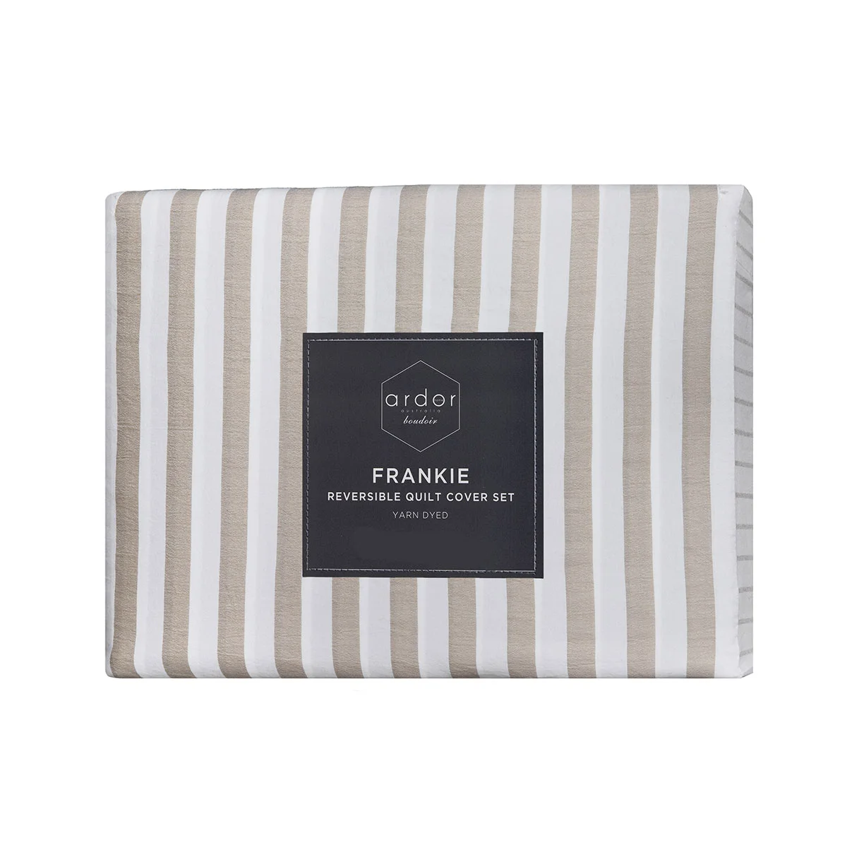 Designed to be the complimentary addition to your bedroom. Ardor Frankie Natural Stripe Yarn Dyed Reversible Quilt Cover Set, features subtle stripes in natural and white hues that help ground your bedroom style in a realm of relaxation and sophistication. Made from quality polyester fabric for long lasting use.