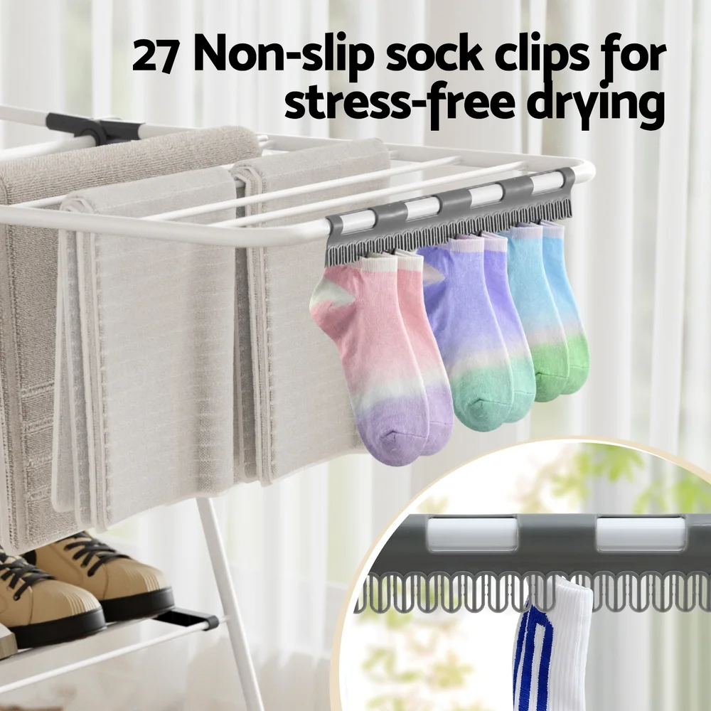 The Artiss Clothes Drying Rack is the perfect solution for all your laundry needs. With 18 sturdy drying rods and 27 non-slip sock clips, it provides abundant space for drying clothes, towels, and more. Its space-saving, foldable design makes storage a breeze, while the lightweight construction ensures easy portability. Suitable for both indoor and outdoor use, this rack is durable, easy to clean, and ready to meet your drying requirements.