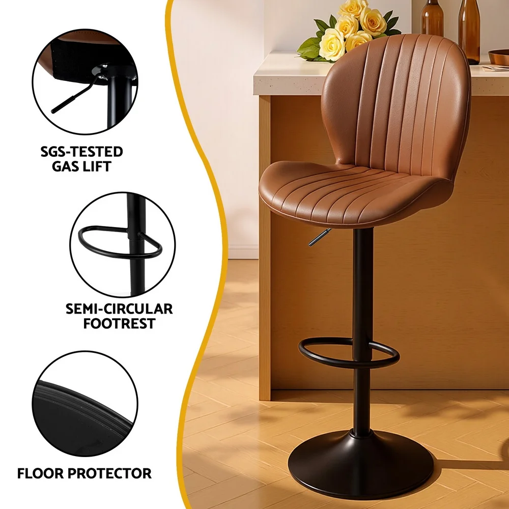 This set of 2 premium bar stools combines modern aesthetics with practical features. Upholstered in brown PU leather, the contoured shell-shaped seats with a vertical stripe pattern offer both comfort and style. The adjustable height (95–113cm) makes these stools versatile for various counter or bar setups. Built with a sturdy metal frame, reinforced gas lift cylinder, and 120kg weight capacity per stool, they are designed for durability and stability. Anti-slip floor protectors and a semi-circular footrest ensure safety and comfort, while easy assembly saves you time. Perfect for kitchens, dining areas, or commercial spaces, these stools are a must-have for any modern interior.