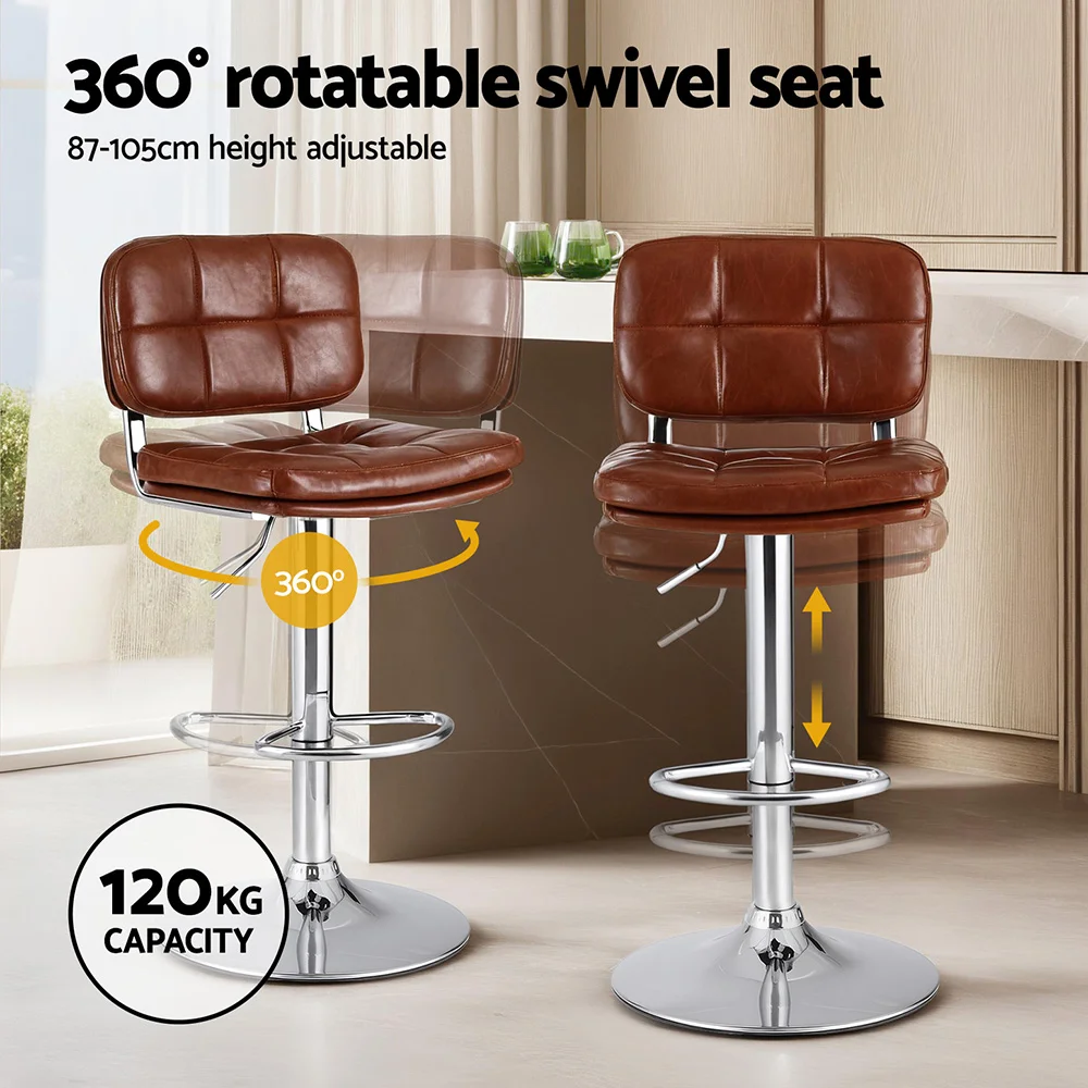 Upgrade your seating experience with our modern adjustable bar stools. Featuring ergonomic square tufted PU leather seats, these stools offer both style and comfort. Adjust the height effortlessly from 87-105cm to suit various spaces such as your kitchen or bar area. With a sturdy metal frame and reinforced gas lift cylinder, each stool supports up to 120kg. The semi-circular footrest and anti-slip floor protectors enhance comfort and safety. Easy and tool-free assembly ensures a hassle-free setup. Elevate your home today with this functional and stylish set of 2 bar stools.