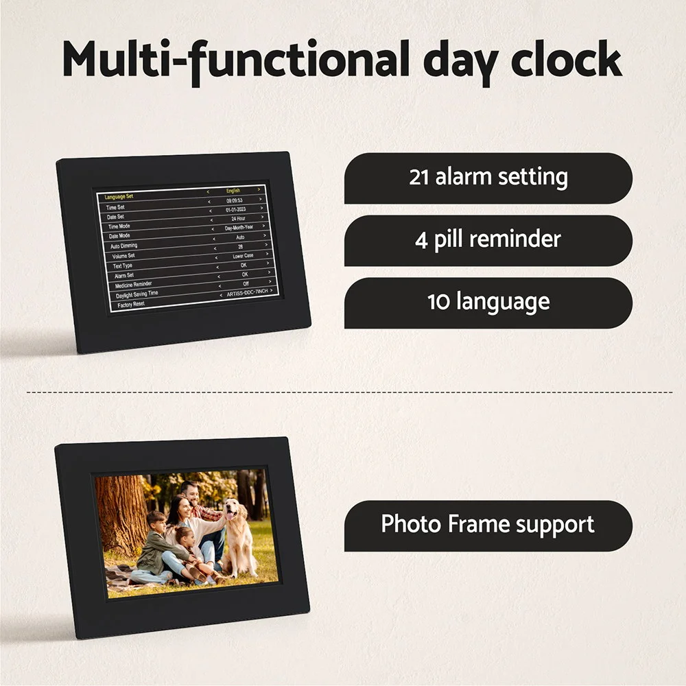 Simplify your mornings and evenings with this versatile Digital Day Clock. Featuring a large, clear, and eye-catching 8-inch LCD display, it can be positioned on your desk or mounted on the wall for optimal visibility. The auto-dimming function adjusts brightness automatically for comfortable viewing throughout the day and night.