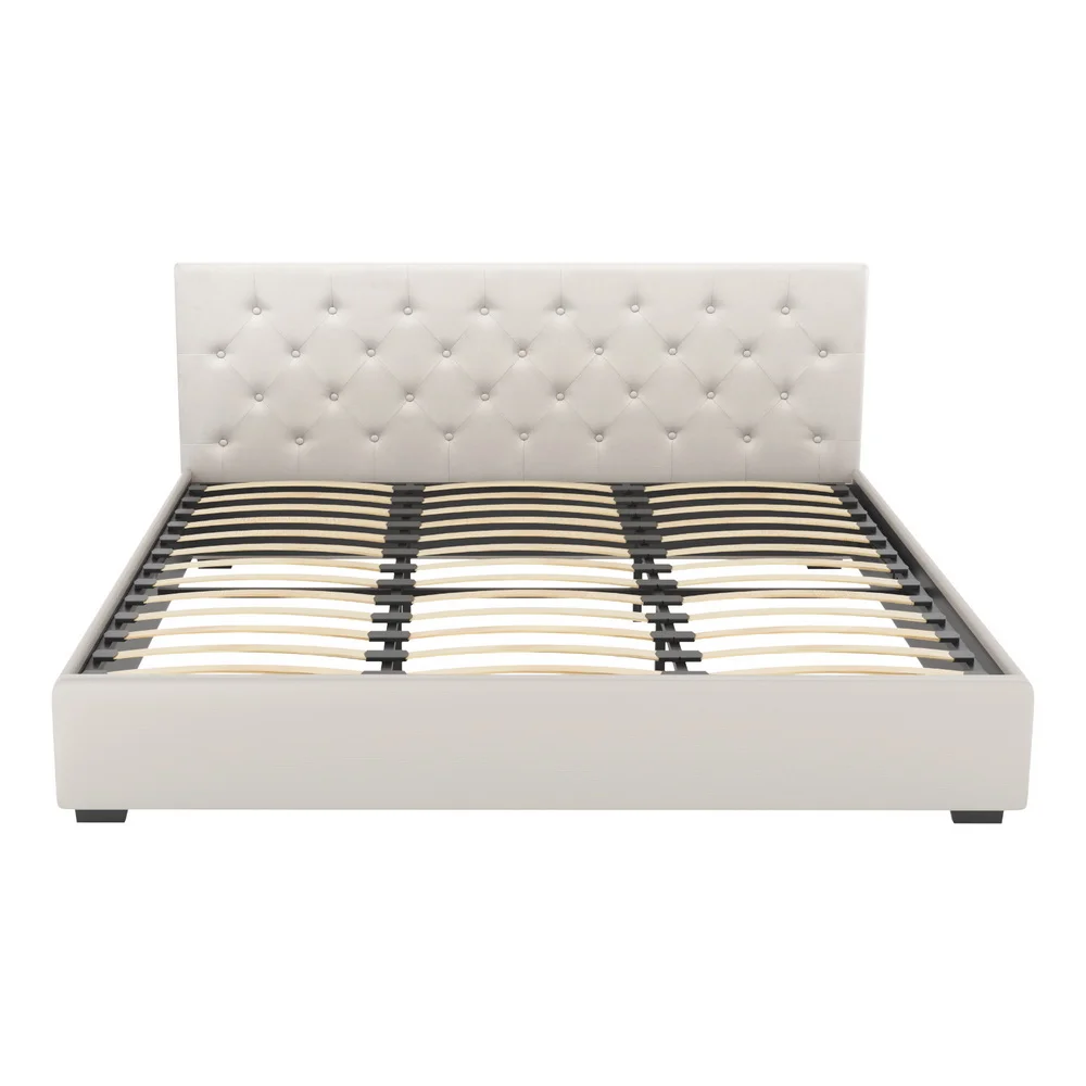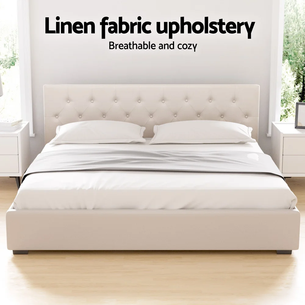 Enhance your bedroom with the Artiss Vila Gas Lift Bed Frame. Upholstered in linen fabric, the tufted headboard and sides showcase the sleek design. Beneath the exterior lies a hidden surprise – a spacious storage compartment accessed easily with the gas lift mechanism. The wooden arched slat base flexes to distribute weight evenly, minimising motion transfer for uninterrupted sleep. Reinforced with steel bars, heavy-duty metal connectors, and an adjustable centre support beam, this bed frame offers exceptional support and stability.