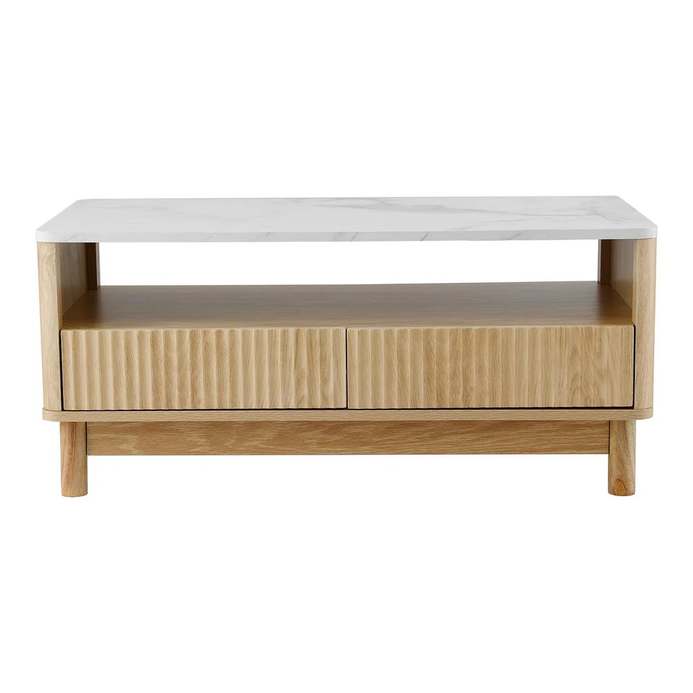 Elevate your living room with the Artiss Coffee Table, featuring a stunning marble finish tabletop and a fluted drawer panel design. This elegant centerpiece includes a spacious open shelf and two smooth-sliding drawers, perfect for keeping your essentials organised. Crafted with pine wood legs for durability and designed with safe round corners, it combines style and function effortlessly. The smooth surfaces ensure easy cleaning, making it an ideal choice for modern homes.