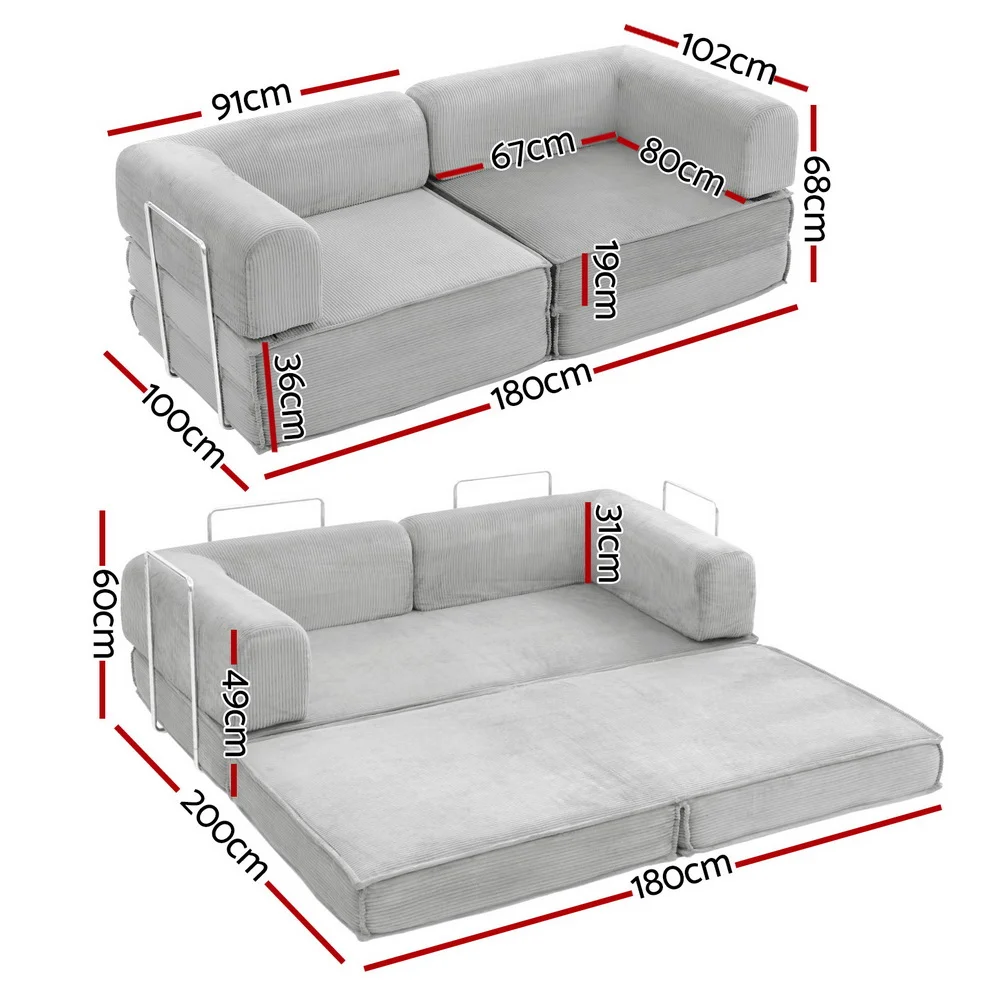 The breathable corduroy fabric and high-density sofa bed mattress guarantee lasting comfort. In sofa mode, it measures 180 x 100 x 68 cm, and expands to an impressive 180 x 200 x 60cm,when opened for sleeping. This makes it ideal for small spaces, serving as both a sofa and a foldable sofa bed!