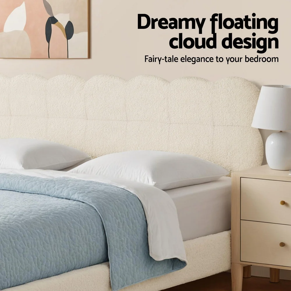 Artiss cloud headboard bed frame in white. Features boucle fabric upholstery and durable wood and metal construction. This platform base fits double mattresses. Includes wooden slats and metal legs for strength. Easy to assemble. Supports up to 300KG. Note: Actual colour may vary.