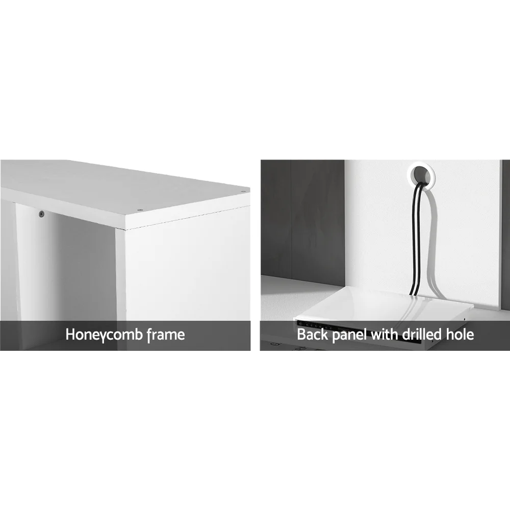 Make the most out of your entertainment space with the Artiss Brian Entertainment Unit. Boasting 11 spacious compartments, the unit will hold all of your favourite d��cor pieces, DVDs, CDs, games, consoles, books and more! The piece is made from thick 30cm honeycomb board and 15mm particle board with a melamine finish for stability, durability, and a smooth, clean finish. The unit has a high-weight capacity across all shelves: 40kg on top, 70kg across the middle shelf, 20kg across the shorter middle shelves, and 10kg per side shelf. A reinforced back panel provides additional stability, while a convenient cable management hole helps to keep your cables organised. With its easy assembly, the only thing left to do is fill it with your best pieces. Buy yours today and turn your living room into the entertainment centre of the home.