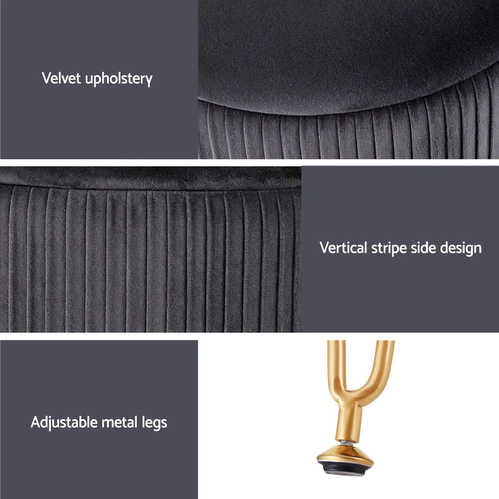 This round velvet Artiss footstool features a reversible table lid, vertical stripe design, durable MDF frame, high-resilience foam padding, and adjustable metal legs with floor protectors. Use it as a footstool, coffee table, and storage. Simple assembly required.