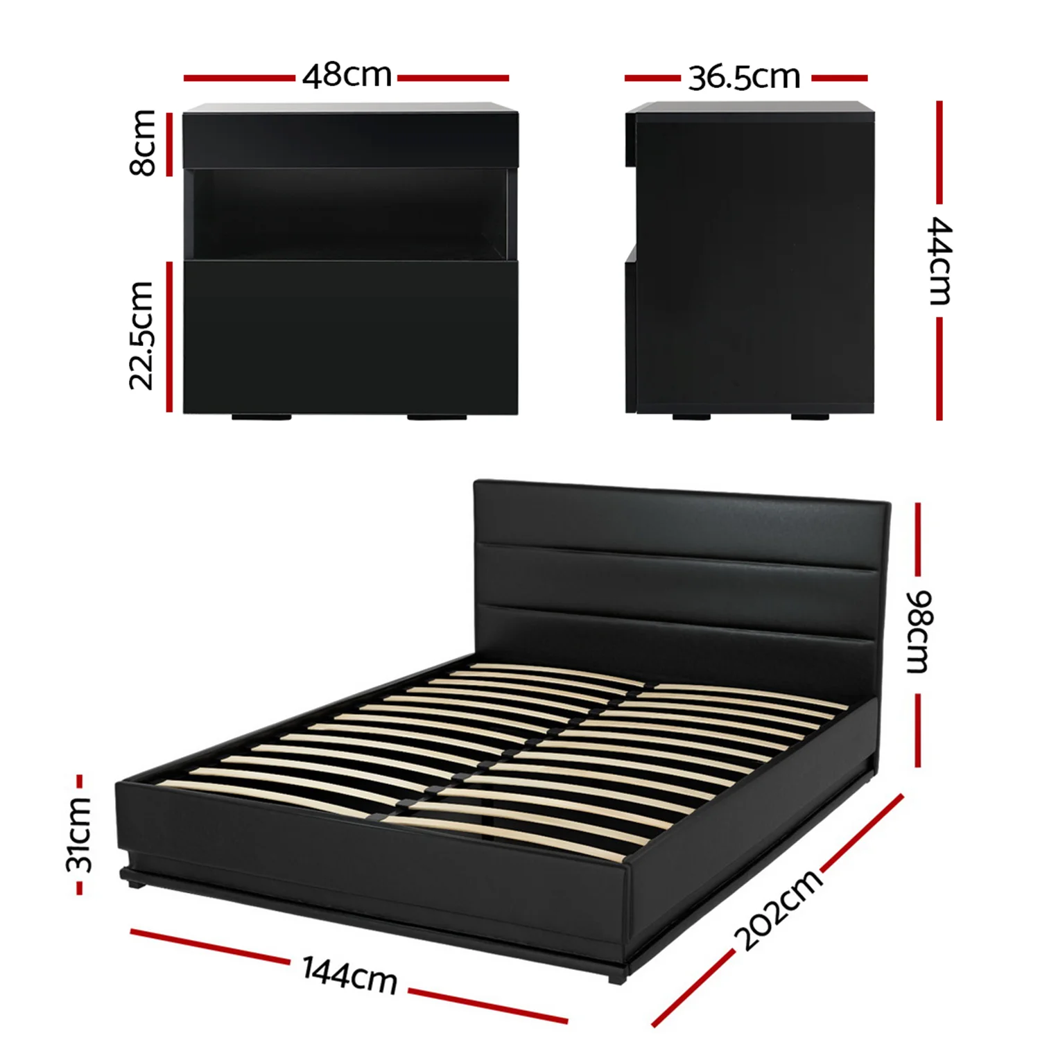 Elevate your sleep space with the Artiss Double Bed Frame and matching LED Bedside Table. Featuring 16 dynamic RGB colours across both pieces, this PVC leather set combines mood lighting innovation with robust storage solutions. The plush foam-padded headboard and gas-lift base offer premium comfort, while UV high-gloss finishes create a sleek centrepiece for modern bedrooms.