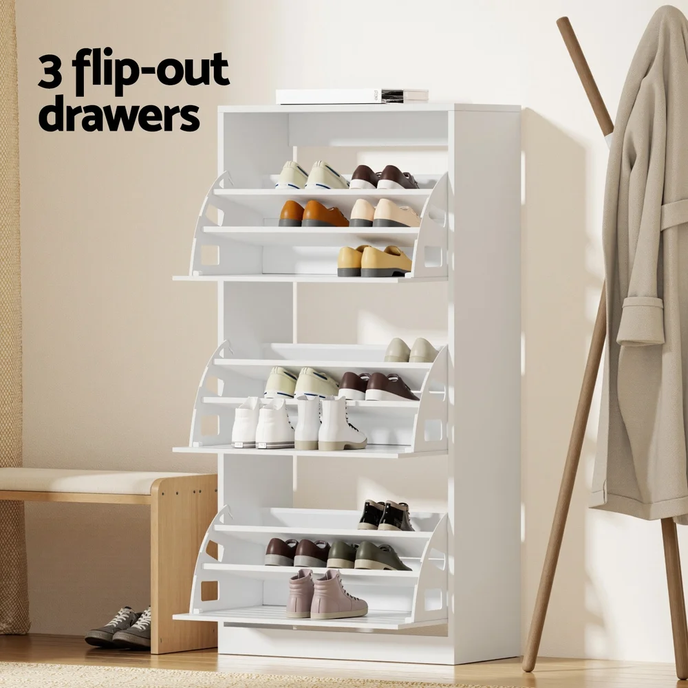 Artiss Shoe cabinet blends rack storage with cabinet convenience, featuring 3 flip-up drawers and 3 adjustable shelves behind slatted ventilation doors. This space-smart entry organiser holds 21-45 pairs (men's/ladies'/kids' sizes) across tiered racks. Built from tough particleboard with 40kg top strength and push-open ease. Comes with wall attachment for safe install - brilliant for hallway shoe storage with 30kg drawer limits.