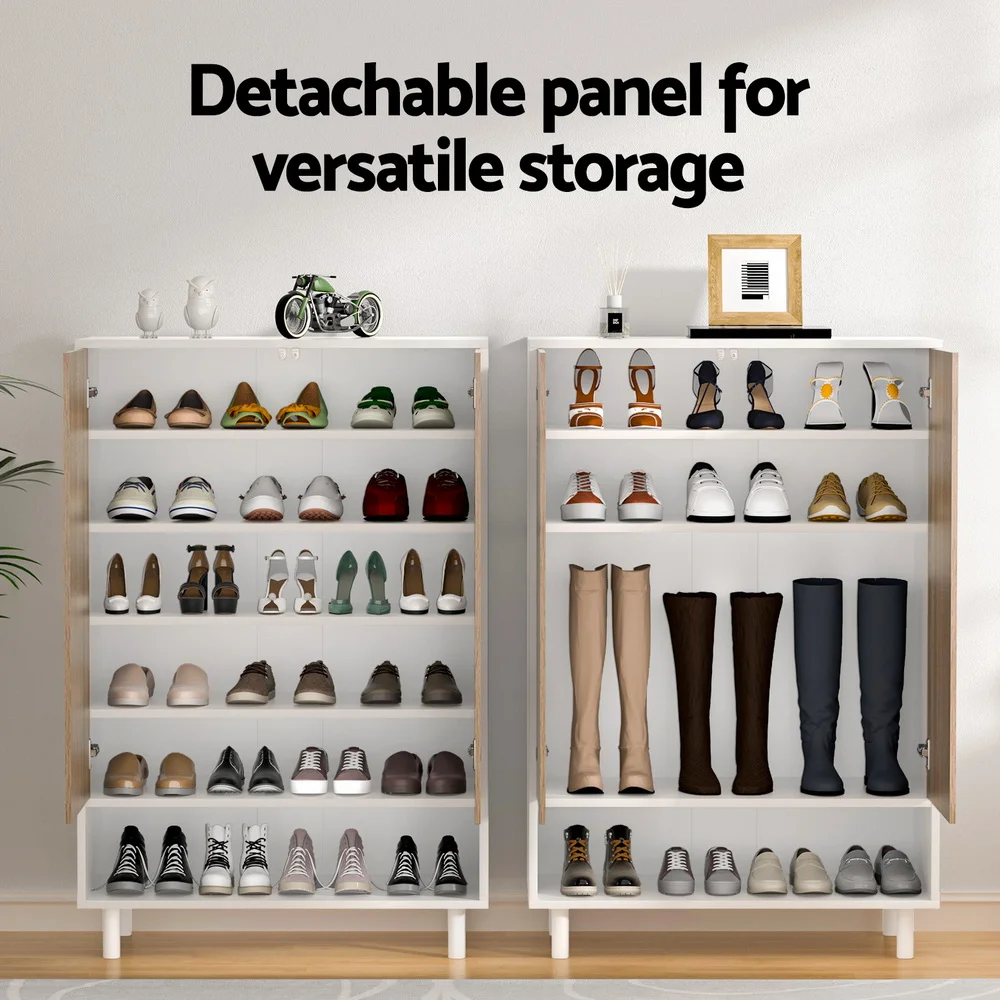 This Artiss shoe cabinet features a particle board frame with a paper veneer finish, herringbone-patterned MDF board, and pine wood legs. It includes a detachable panel, push-to-open door, open bottom shelf, and stores up to 24 pairs. Easy to clean and assemble.