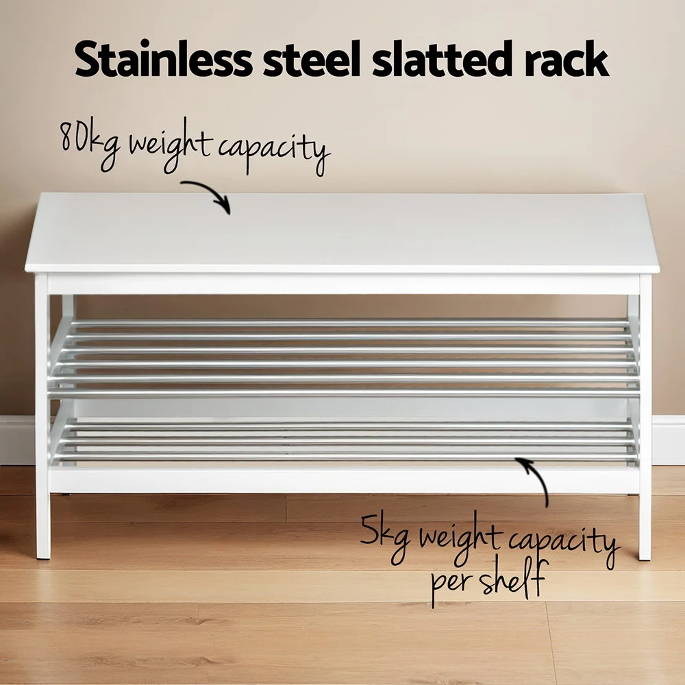 Organise your shoes with practicality and style with the Artiss Kubota Shoe Storage Bench. Constructed using a bamboo frame with stainless steel tubes, the bench is sturdy and durable and can hold up to 10 pairs of shoes (depending on shoe size). The round edges are not only stylish but prevent accidental bumps and scrapes. The bench holds up to 80kg and the two tiers can hold up to 5kg each, giving you plenty of room for storage. Assembly is a breeze, making it convenient for anyone to set up. Say goodbye to cluttered entryways and hello to a tidy shoe storage solution with the Artiss Kubota Shoe Storage Bench.