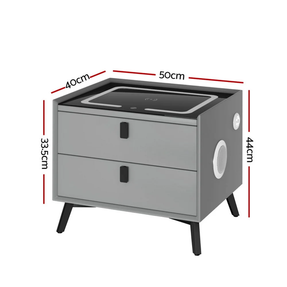 The Aika Smart Bedside Table is designed with both form and function in mind. Two spacious drawers with stylish metal handles offer plenty of storage for your everyday essentials, keeping your living area clutter-free. The light-up charging panel can be adjusted to create the perfect ambiance, whether you're winding down for the night or entertaining guests. Sturdy metal legs ensure stability, while anti-slip pads protect your floors and keep the table securely in place. The the table's easy-to-clean surface makes maintenance easy. With its combination of modern technology and classic design, the Artiss Aika Smart Bedside Table is sure to become a cherished centrepiece in your home.