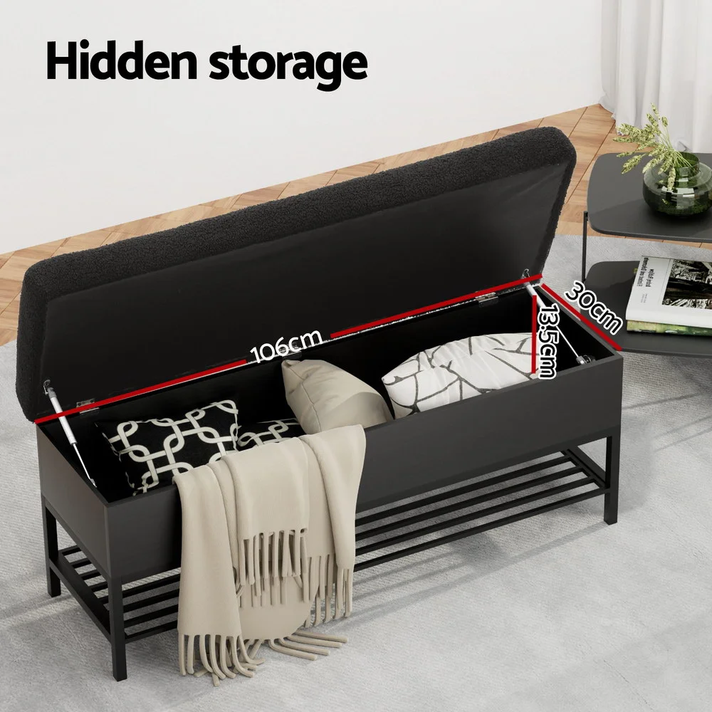 Soft boucle-upholstered Artiss storage ottoman with an MDF frame for durability. Features high-resilience foam padding for comfort and a hidden storage compartment. Includes an open shelf for additional storage. Equipped with sturdy metal hinges and easy assembly.