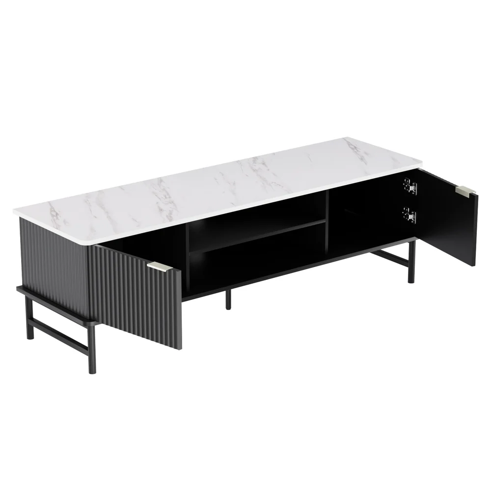 Introducing the Kaisu Entertainment Unit, a stylish and functional addition to your living space. This unit features a marble-effect tabletop, two cabinets with reeded door panels and two open shelves, adding a touch of elegance to its design. With its sturdy construction and adjustable metal legs, it not only provides durability but also adds a modern flair to your room. The Kaisu Entertainment Unit is not only aesthetically pleasing but also practical. It comes with floor protectors to prevent any damage to your floors and cable management to keep your wires organised and tangle-free. With its high weight capacity, you can confidently store your entertainment devices and accessories. Assembly is a breeze, making it easy for you to set up and enjoy your entertainment area in no time. Entertain in style with the Kaisu Entertainment Unit from Artiss.