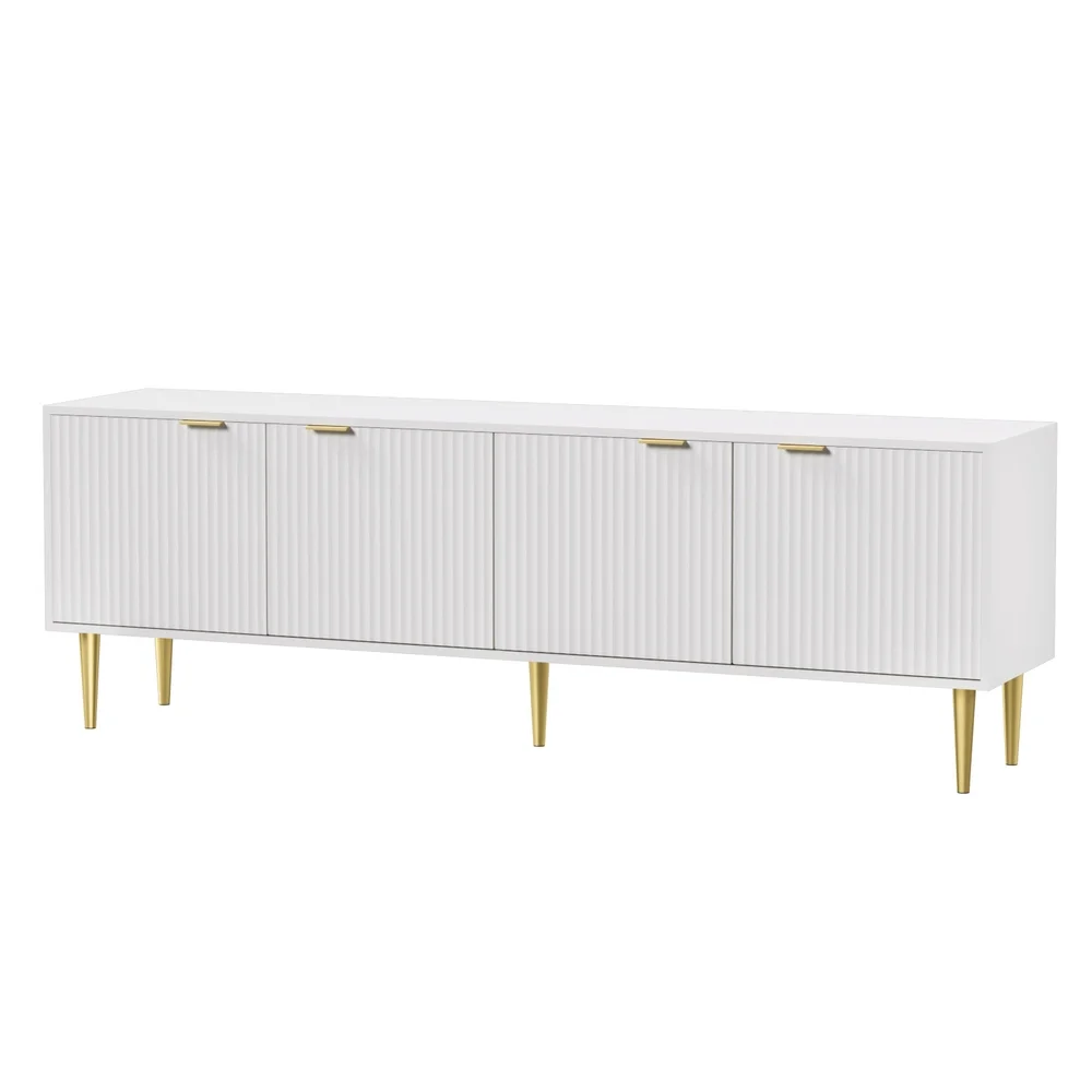 Introducing the Riley Entertainment Unit, a stylish and functional addition to your living space. This unit features a 4-door cabinet with reeded door panels, adding a touch of elegance to its design. With its sturdy construction and metal golden legs, it not only provides durability but also adds a modern flair to your room. The Riley Entertainment Unit is not only aesthetically pleasing but also practical. It comes with floor protectors to prevent any damage to your floors and cable management to keep your wires organised and tangle-free. With its high weight capacity, you can confidently store your entertainment devices and accessories. Assembly is a breeze, making it easy for you to set up and enjoy your entertainment area in no time. Entertain in style with the Riley Entertainment Unit from Artiss.