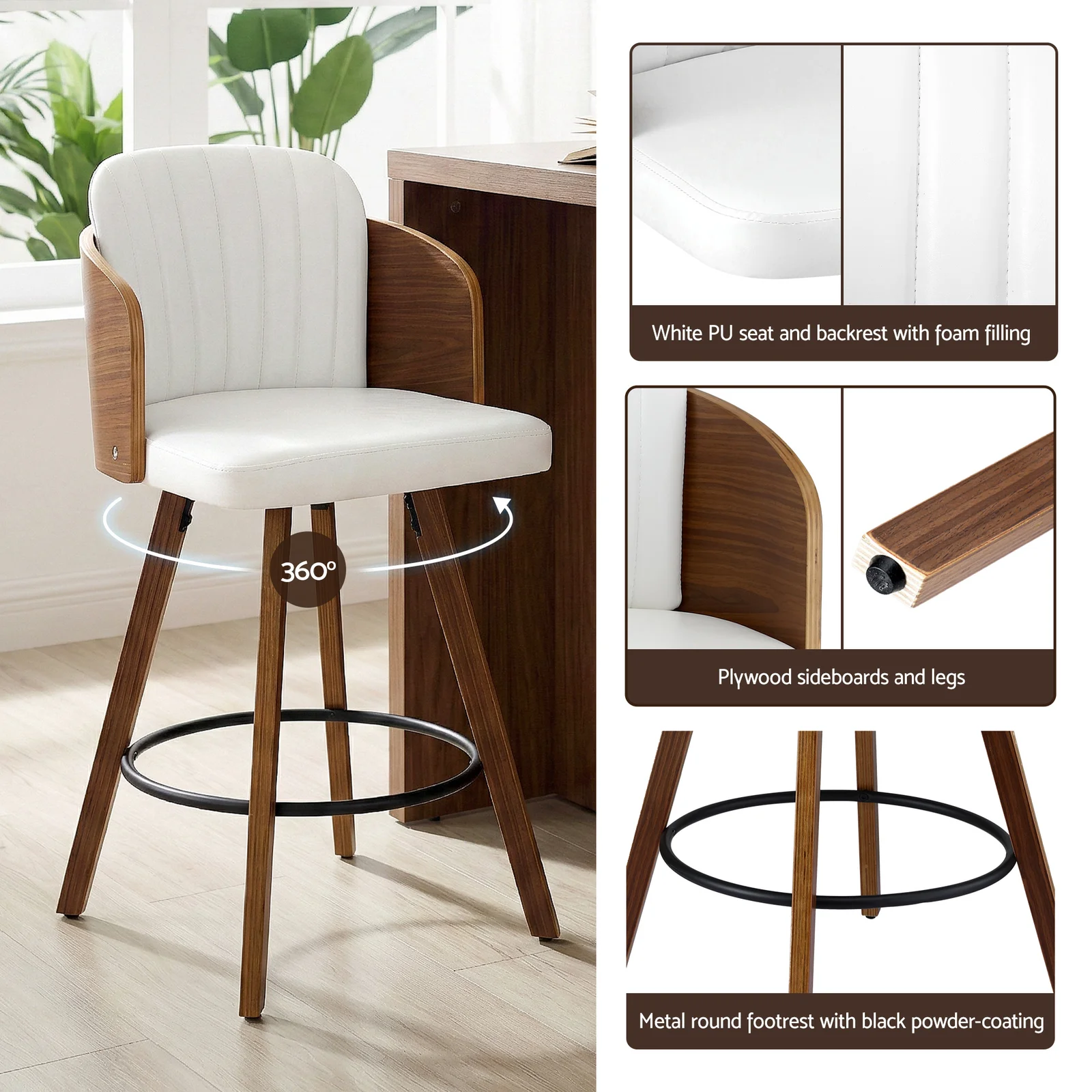 Transform your living space with a seating solution that marries sophisticated aesthetics with functional design. Our 360° Swivel Bar Stool is more than just a chair; it's a statement piece crafted for the modern Australian home. Whether you are enjoying a quick morning coffee at the kitchen stool or entertaining guests at your home bar, the seamless swivel and ergonomic silhouette ensure you do so in absolute comfort. Designed with a stunning contrast of white upholstery and rich plywood textures, these bar stools bring a fresh, upscale vibe to any interior.