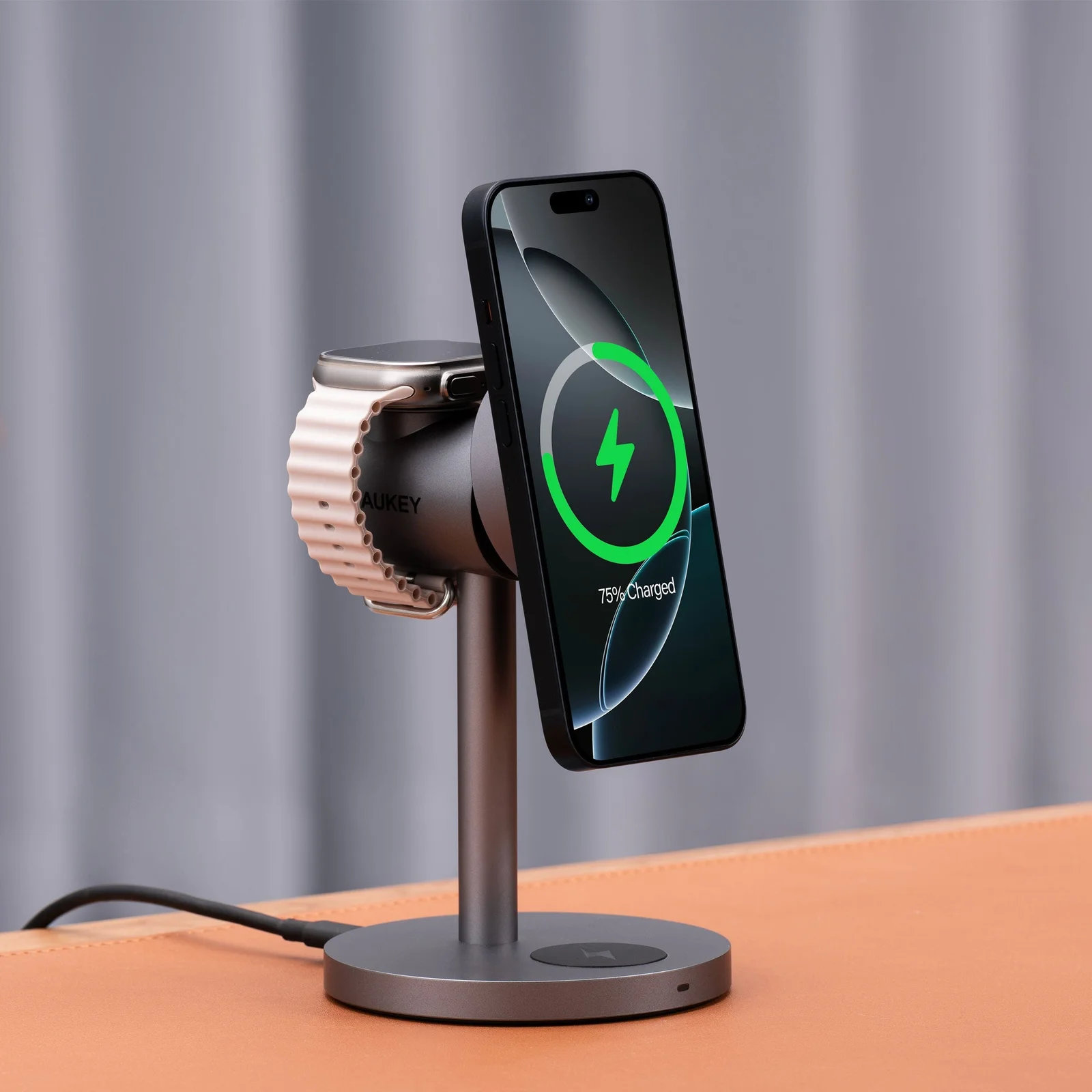 Simplify your charging experience with the AUKEY MagFusion 3-in-1 Wireless Charging Station. Designed with Qi2 MFW certification, this versatile station offers up to 15W of magnetic fast charging for your iPhone, Apple Watch, and AirPods simultaneously. Say goodbye to cluttered cables and enjoy a sleek, organized charging solution that powers all your essential devices in one place. Its robust design ensures long-lasting durability, while the magnetic alignment keeps your devices securely in place for efficient charging every time. Whether on your desk or nightstand, the compact and stylish design integrates seamlessly into any environment.