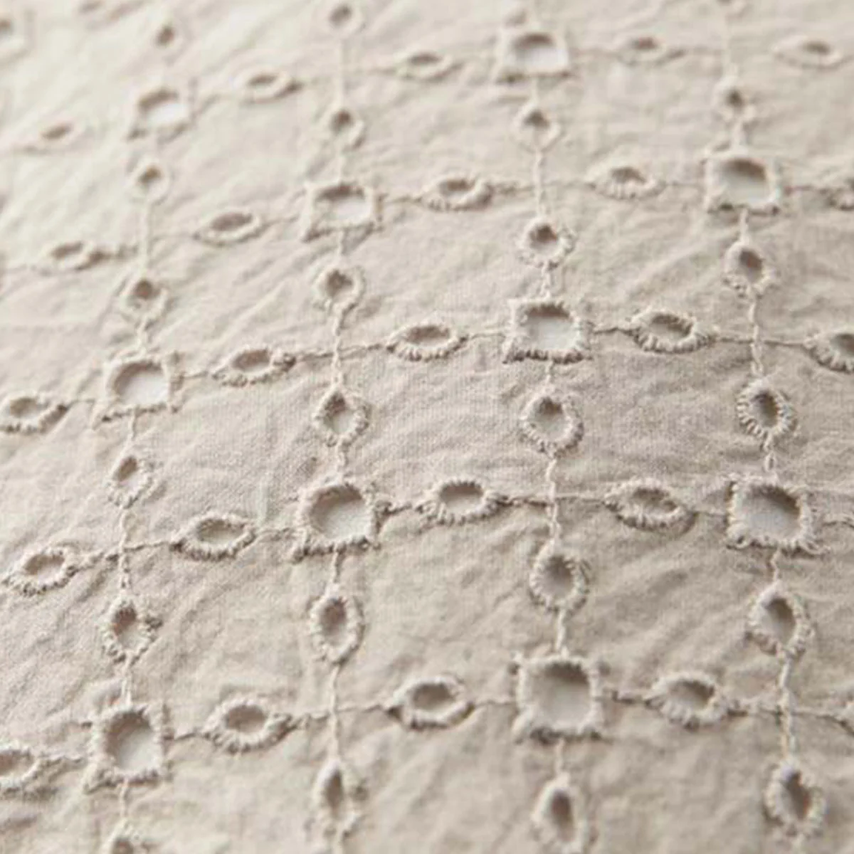 Decorative Chelsy Cotton Cover Square Filled Cushion 40cm x 40cm by Bedding House picks up on the broderie anglaise trend. The front of the decorative cushion features off-white, embroidered holes on a sand background. The back of the cushion has a solid sand colour. This decorative cushion is available in various colours. Decorative cushion Chelsy is made of 100% cotton. The size is 40 x 40 cm. The cushion has a zipper at the bottom and comes with a resilient polyester inner cushion. Nice detail: the cushion has a golden puller at the zipper in the shape of an Amsterdam canal house. The cushion is not suitable for machine washing or tumble drying.