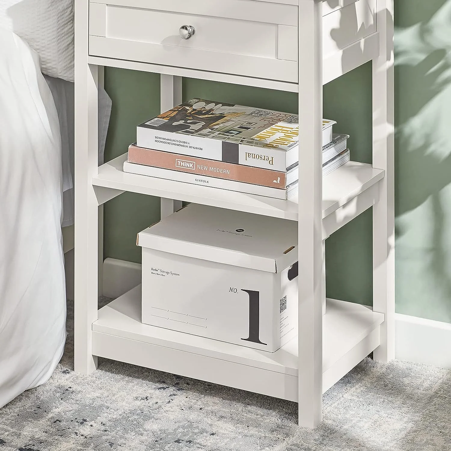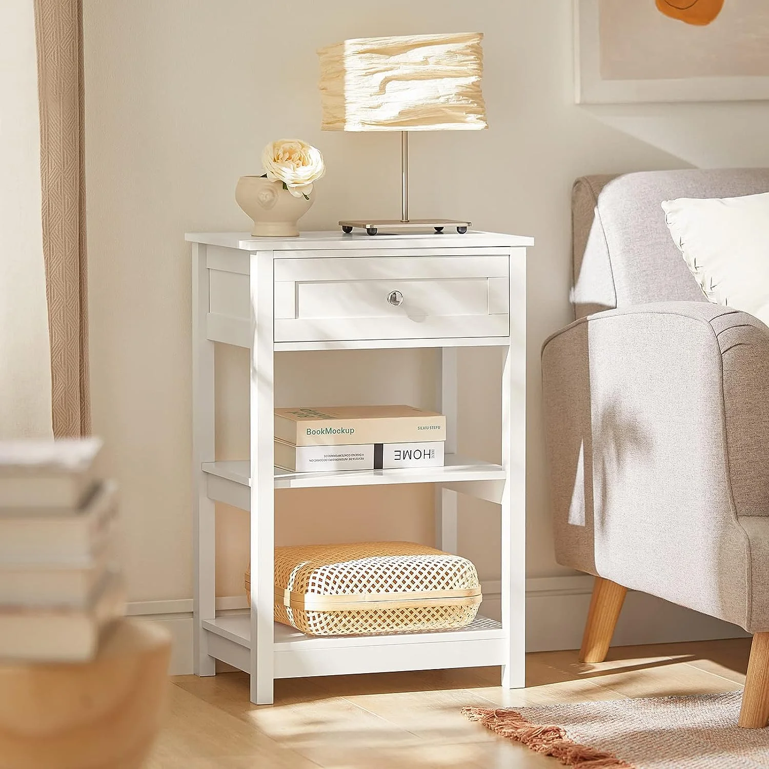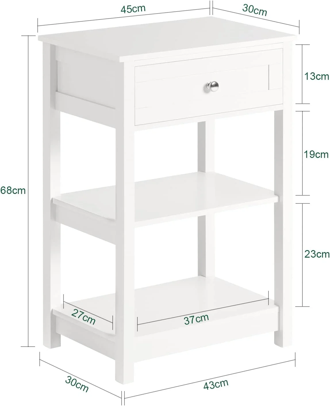 - This bedside table is the perfect addition to any bedroom or living room. It features one drawer and two shelves, providing ample storage space for books, magazines, and other items. The sleek design and sturdy construction make it a great choice for any home.