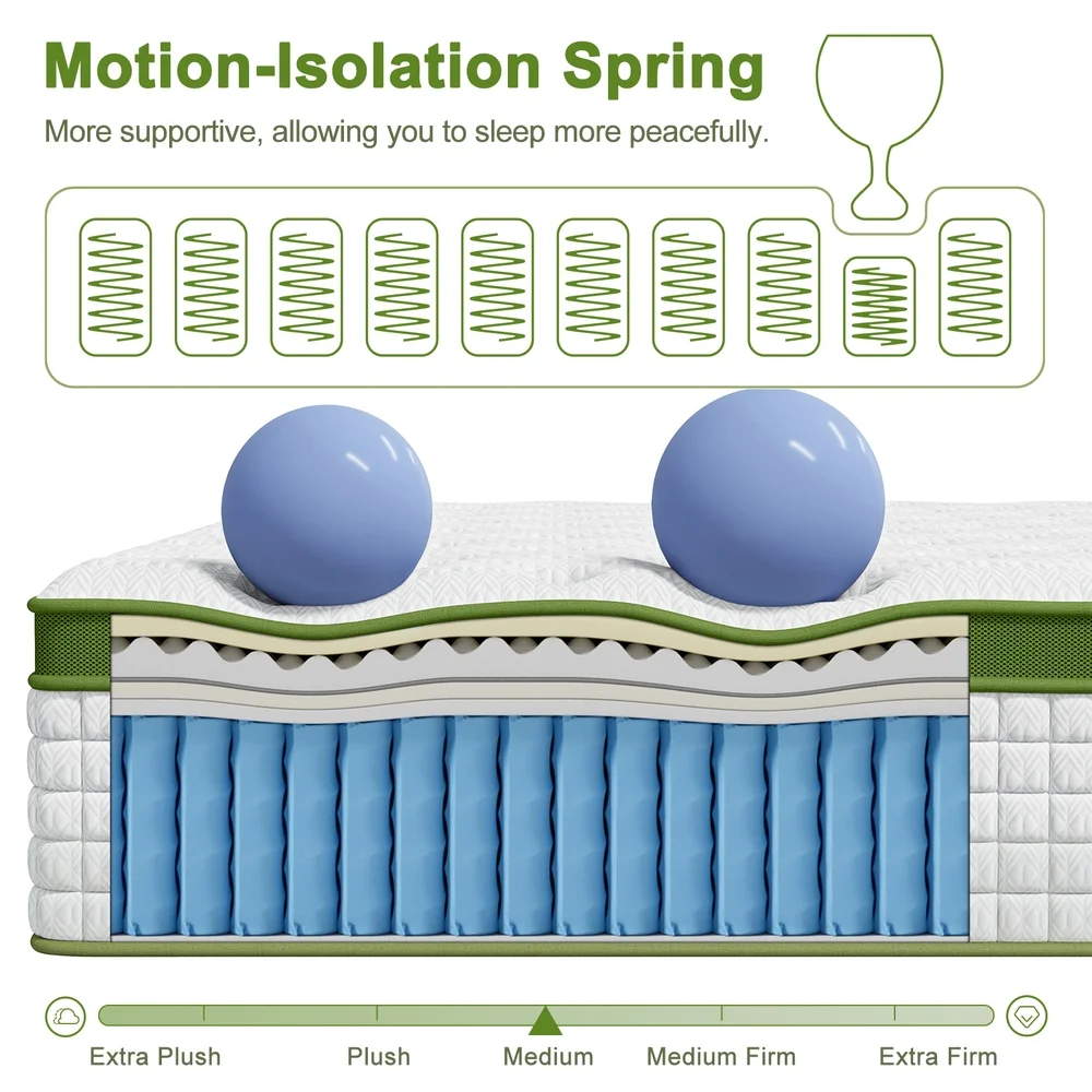 Designed with a balanced **Medium Firm** feel, it cushions curves while maintaining spinal alignment, ideal for side sleepers and back pain relief. **5-zone pocket coils** move independently for targeted support to 7 key areas, virtually eliminating motion transfer.