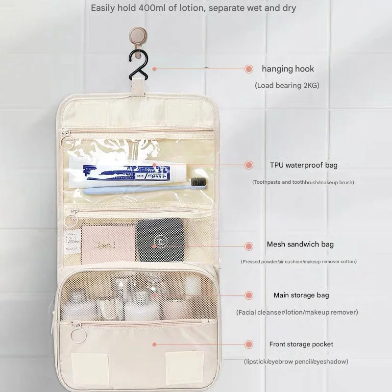 Beige Portable Hanging Travel Toiletry Bag - Large Capacity Cosmetic & Wash Organizer with Sturdy Hook