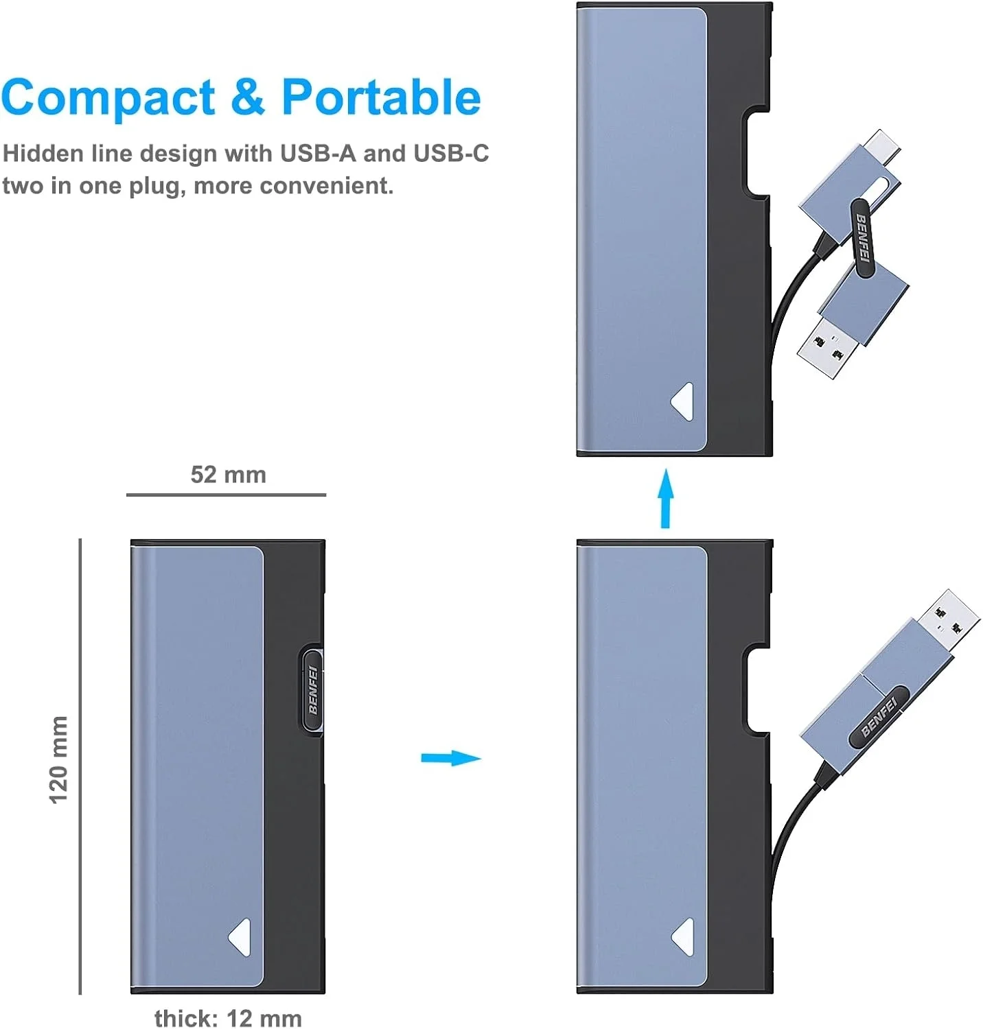 With Type-C/Type-A hidden cord design, the user don't need bring usb type-c or type-a cable in the bag, just pull out the cord from enclosure, plug into the computer. With user friendly ssd installation design, the user could easily install the ssd into the enclosure, and ensure ssd stability and data security in usage.