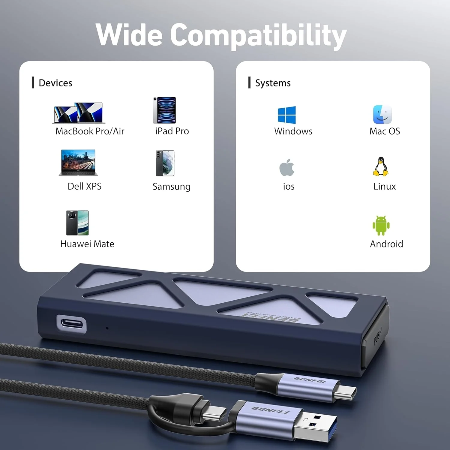 With the latest USB 3.2 Gen2, BENFEI's M.2 enclosure can achieve a data transfer rate of 10Gbps. This enclosure is specially designed to support NMVe protocol M/B&M keys and for 2230/ 2242/ 2260/2280 size SSDs up to 8TB. The M.2 NVMe enclosure is applicable for Windows, Mac OS, Linux, Android, IOS systems.(Does not support SATA NGFF SSD or mSATA SSD)
