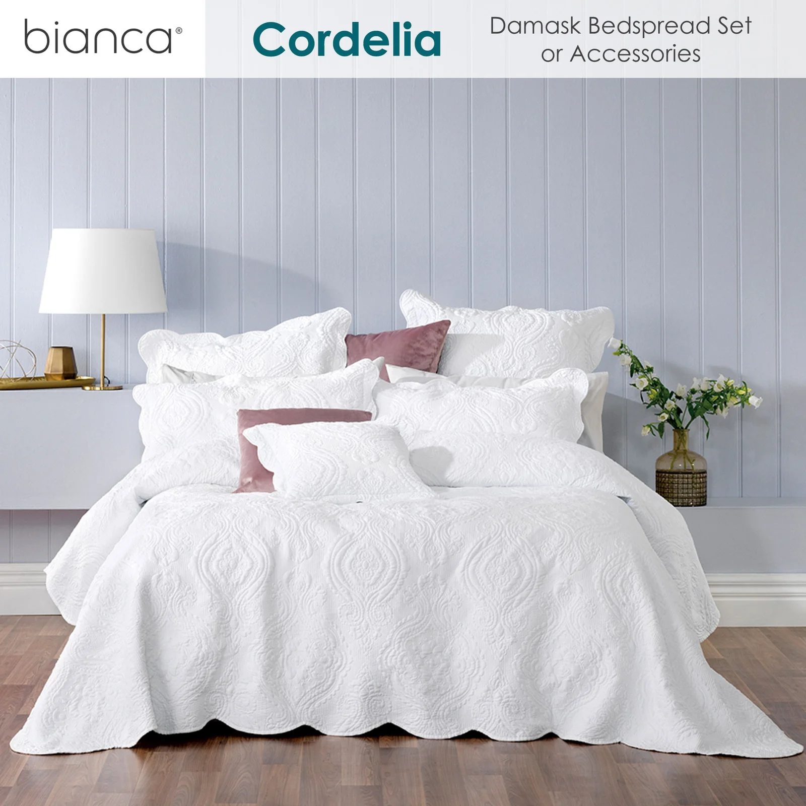 Bring elegance and a touch of class to your boudoir this season with Cordelia Damask Bedspread Set OR Accessories by Bianca Elegance. Fresh and crisp in white, this timeless damask design is sure to become a statement piece that will not date. Embroidered onto super soft easy-care fabric, Cordelia will make you want to stay in bed all day. Finished with a scalloped edge it truly brings the provincial style to life. It is made from Polyester fabric and Polyester fill.