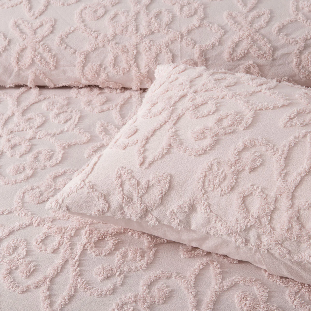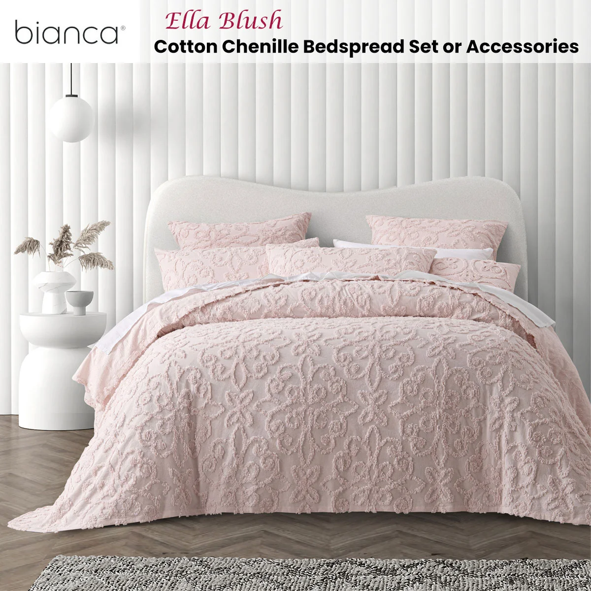 Super soft cotton chenille fabric has been carefully selected by our design team to create this absolutely beautiful Ella Blush Cotton Chenille Floral Bedspread Set by Bianca. A stunning textured motif pattern covers the entire bed. Available in blush and white, this easy-care bedspread is one that you will love. Complete the look with matching accessories.