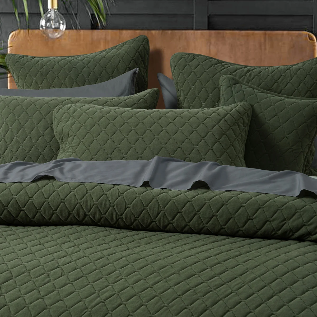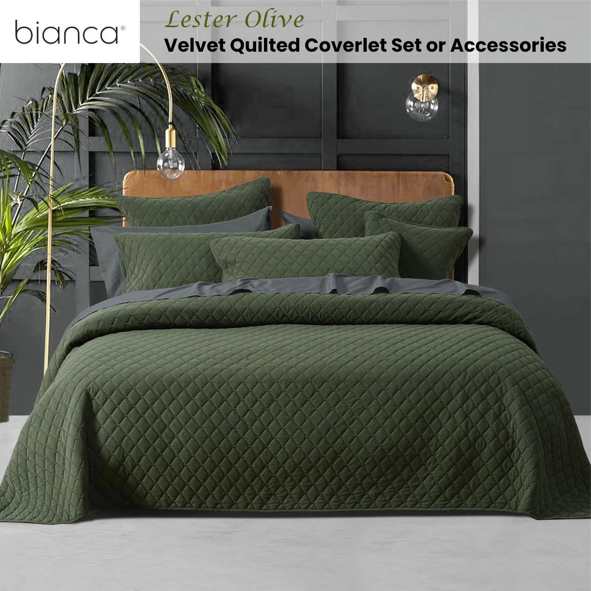 A simple yet classic design. Lester Olive Velvet Diamond Polyester Coverlet Set by Bianca is the perfect shade of olive. Featuring a diamond quilted pattern on a lovely soft velvet fabric. This design is finished with a beautiful, cuffed edge. Complete the look with matching accessories.
