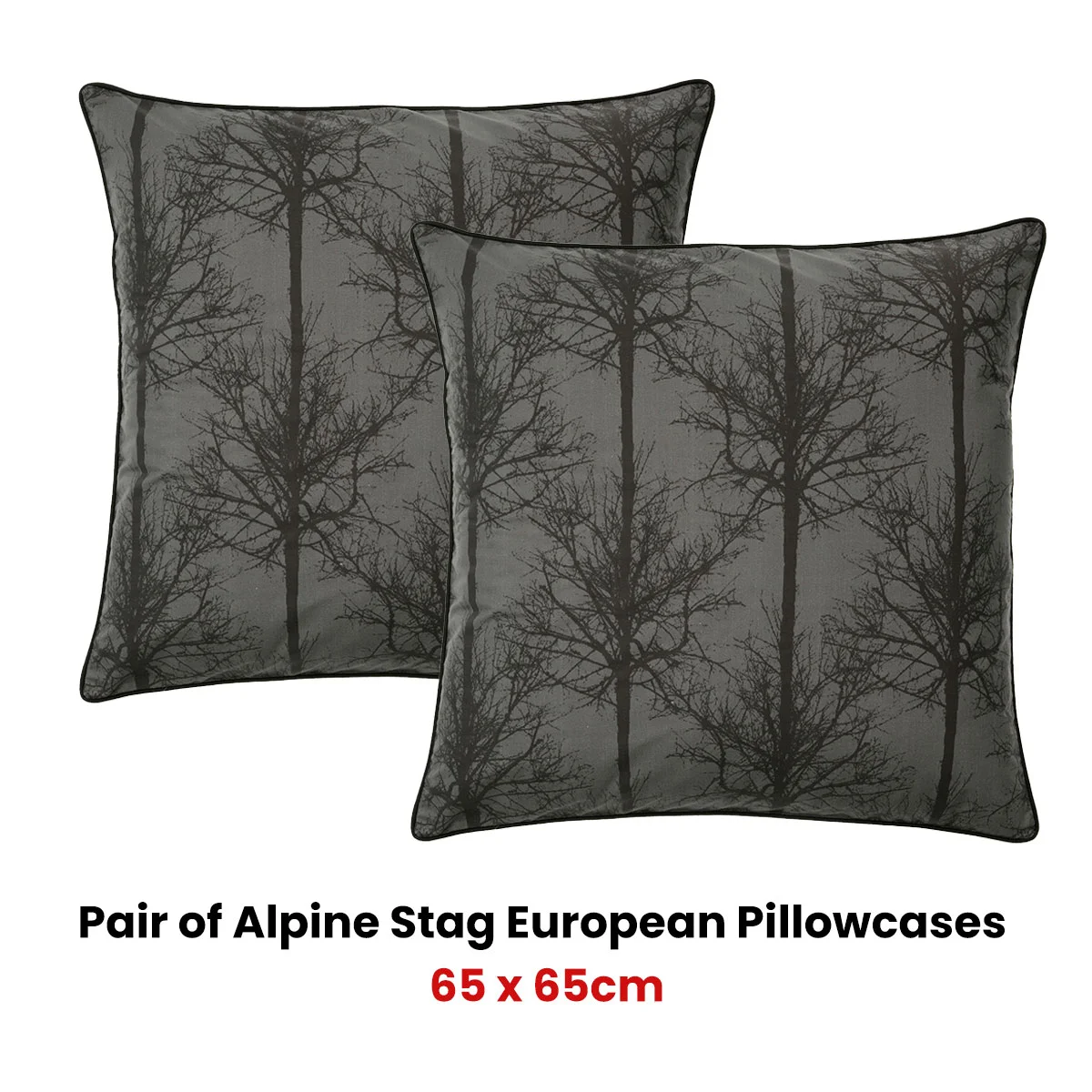 A striking Pair of Alpine Stag Taupe European Pillowcases by Bianca featuring an on-trend printed design and depict the Victorian high country at dusk. This ensemble will surely make a statement. The European pillowcases display a palette of black and grey colour tones.