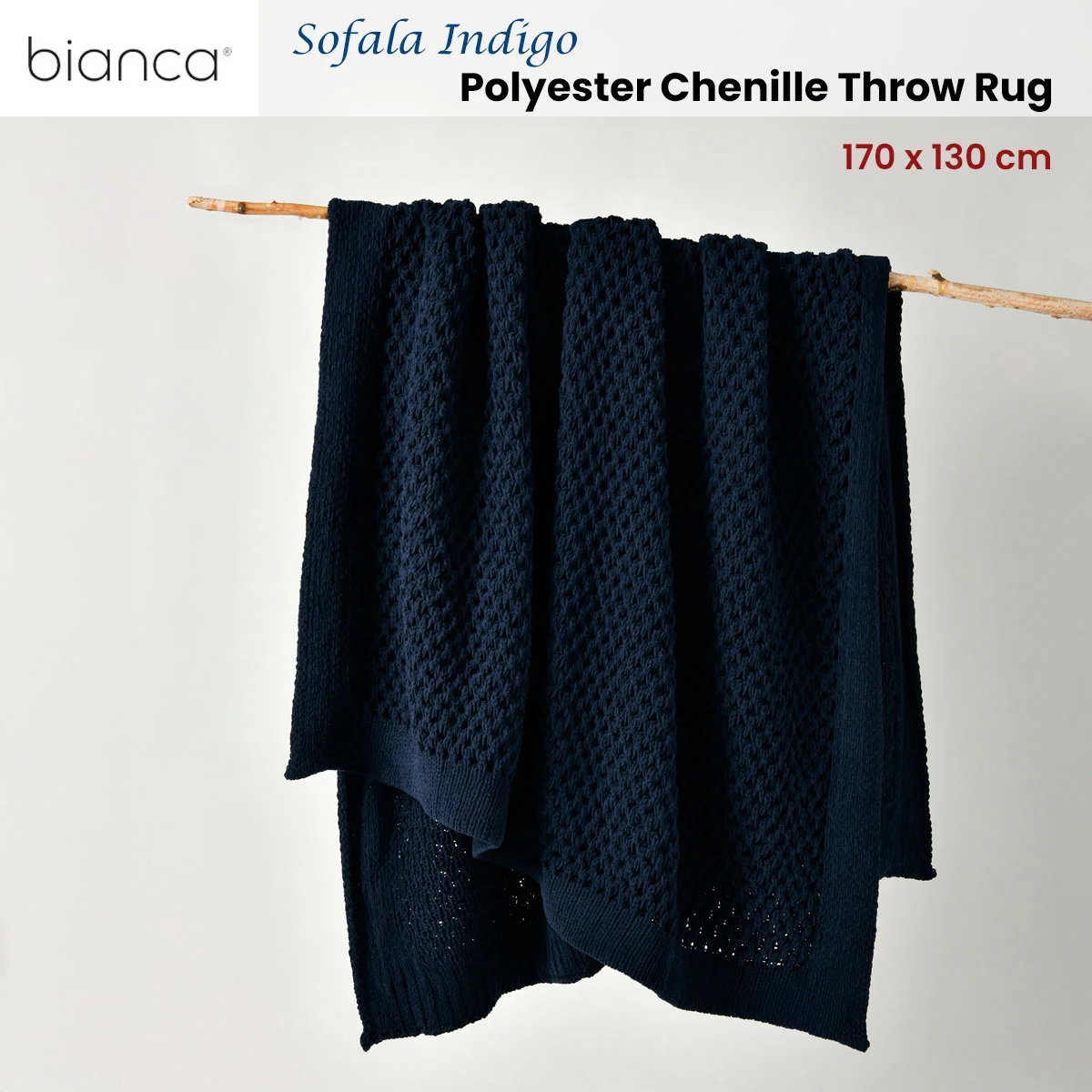 The Bianca Sofala Indigo Polyester Chenille Throw Rug 130 x 170 cm will add colour and elegance to any room. Drape it over your sofa or place it on the bed. Our extensive selection of throws are perfect for any space and are crafted from the softest yarns available.
