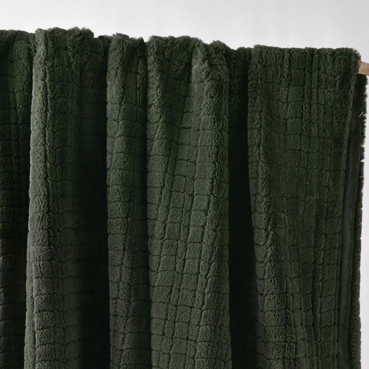 Designed in a forest green tone, this throw rug blends beautifully into any space - neutral, minimalist, or even luxe. The faux fur texture adds a touch of luxury while keeping things casual and inviting. Its subtle grid-like pattern gives it some visual interest without taking away from its simple, calming look.