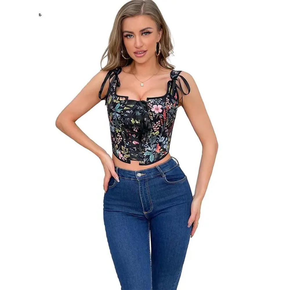Floral Print Renaissance Corset 12 Plastic Bones Front 5 Busk Closure Plus Size - Blue 502 - L