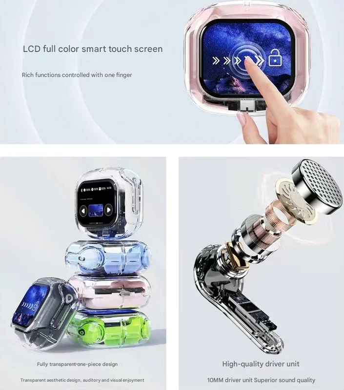 Experience the next generation of wireless audio with these revolutionary TWS earbuds, featuring a stunning full-color LCD touchscreen directly on the charging case. This all-in-one hub puts total control at your fingertips, blending a futuristic transparent design with powerful, immersive sound. Manage calls, music, and a host of smart features without ever touching your phone.