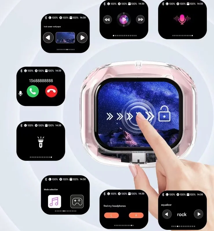 - Revolutionary LCD Touchscreen Case: The charging case features a vibrant smart touchscreen, allowing you to answer calls, control music playback, select EQ modes, find your earbuds, set wallpapers, and even use it as a flashlight, all from the case itself.