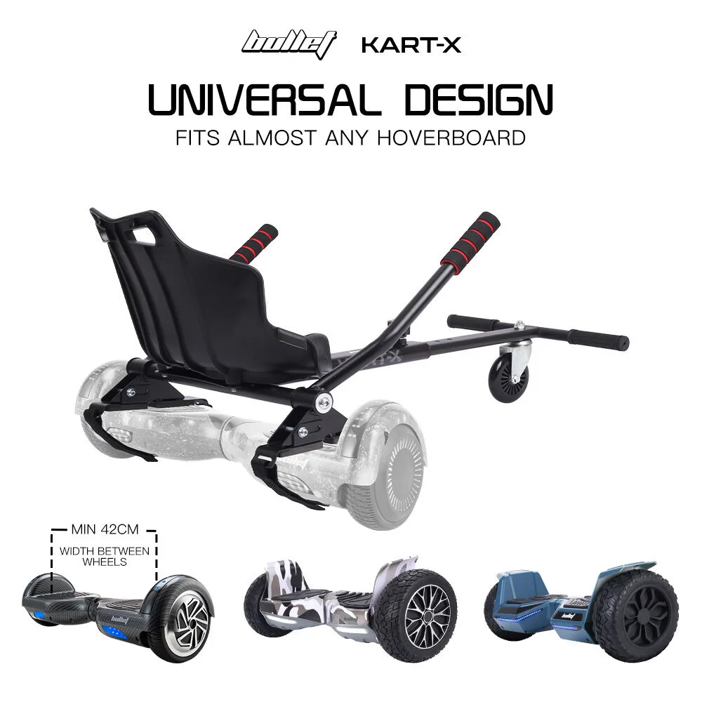 Turn your hoverboard into a go-kart with the Bullet KART-X. Designed to bring serious fun to your ride, the KART-X transforms most 6.5", 8", 8.5" and 10" hoverboards into a fully controllable kart in just minutes.