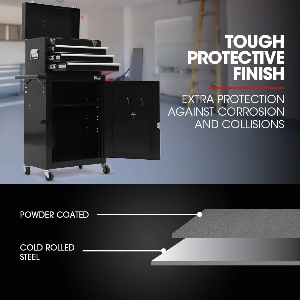 Both the cabinet and chest are built with high tensile powder coated steel enclosures. Equipped with an EVA mat, each drawer slides effortlessly in and out on smooth ball bearing rails, which makes finding and accessing each tool a cinch. The cabinet also comes with 3 pegs and the chest is easily transportable thanks to its side carry handles.
