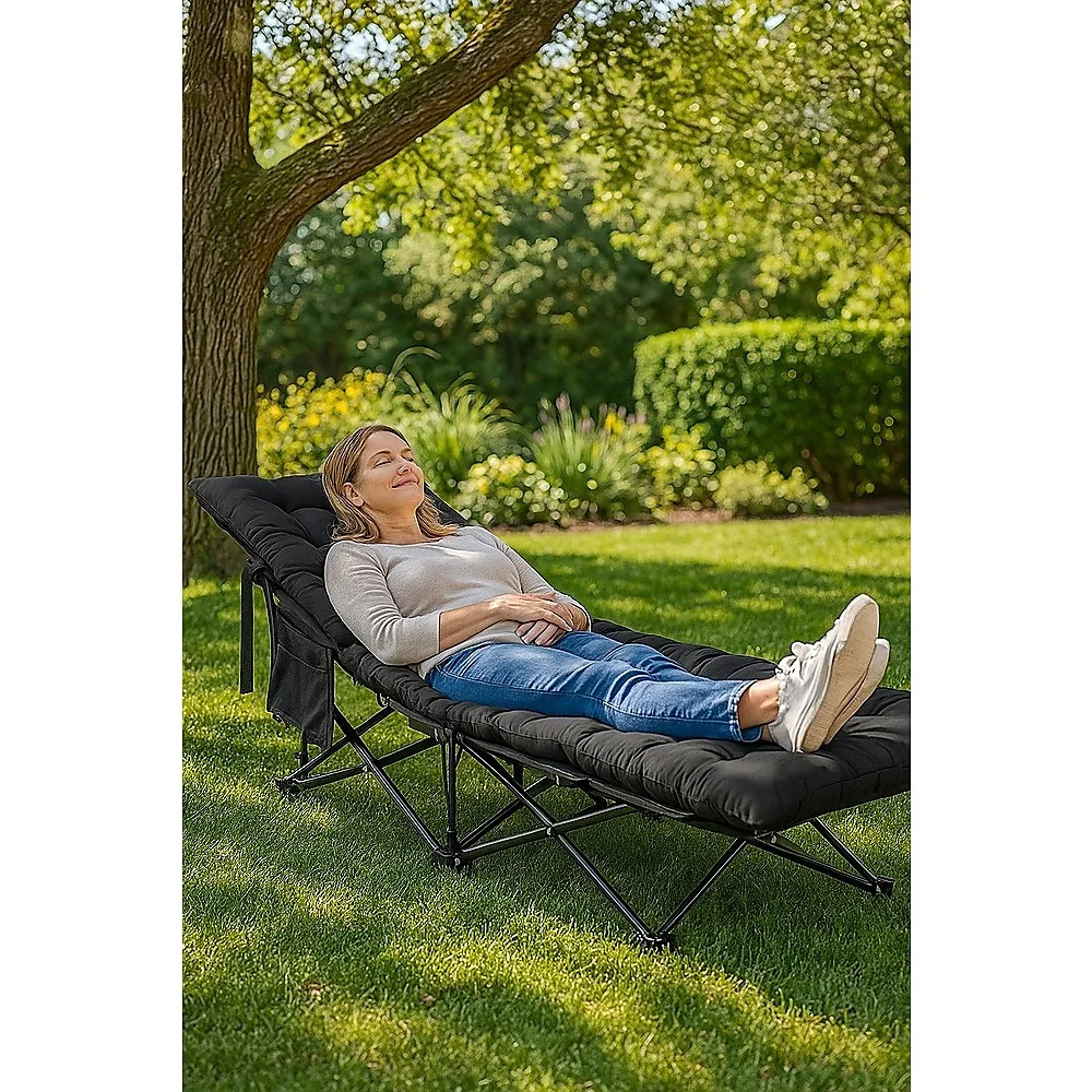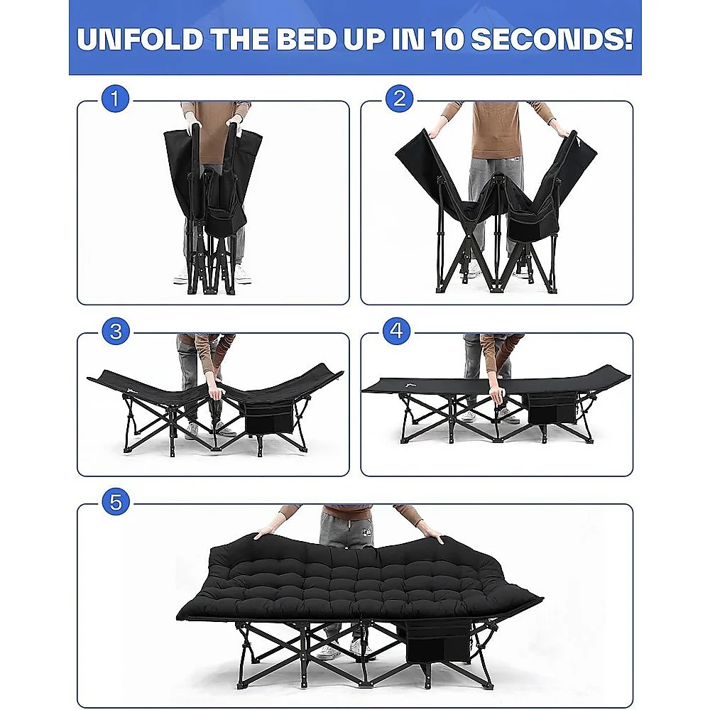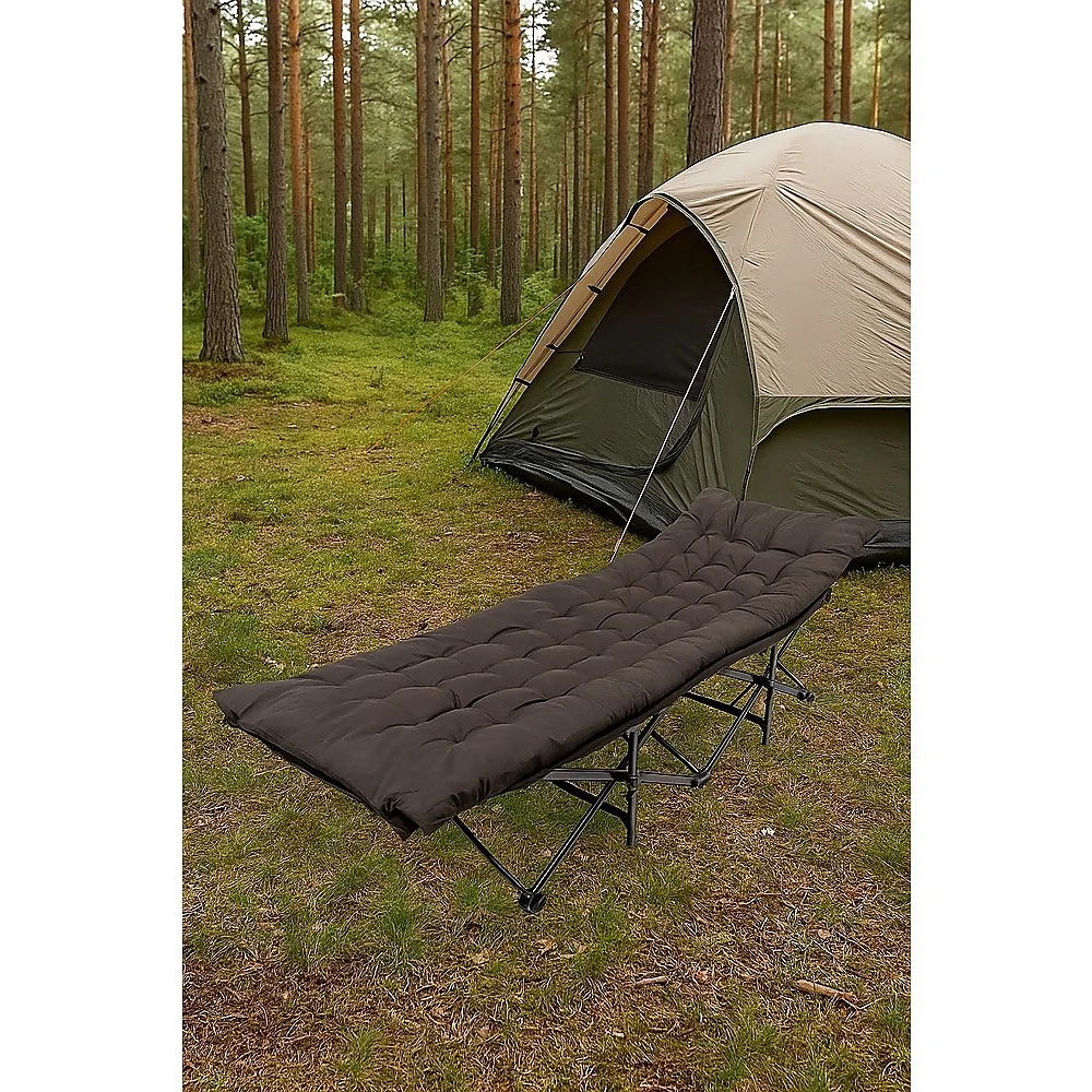 Enjoy superior comfort wherever you go with this foldable camping cot with mattress. Featuring a breathable padded surface, side pockets for essentials, and a heavy-duty frame supporting up to 180kg, it's perfect for camping, beach trips, guests, or office naps. Quick setup and easy storage make it a must-have for indoor or outdoor use.