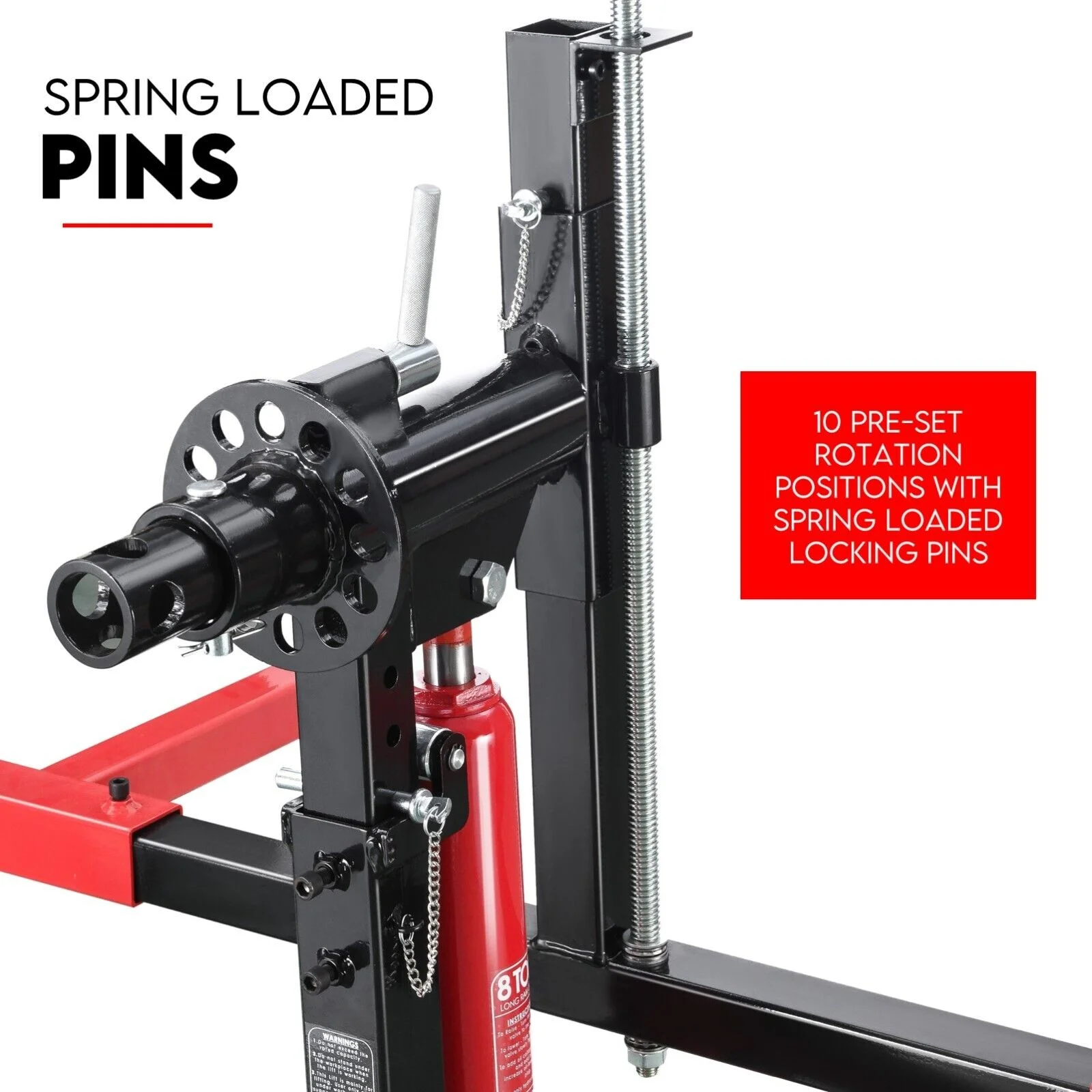 Infinite adjustment (on both ends) with ten locking holes. Every 30 degrees to ease working on any vehicle portion in any position. It fully rotates 360 degrees.