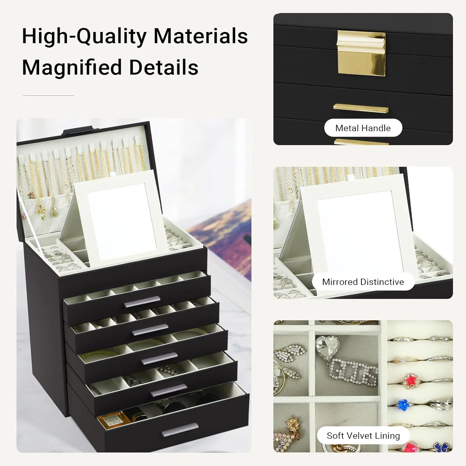 CARLA HOME 6-Layer Large Jewelry Organizer Box for Women with Mirror, Drawers, Hooks & Dividers for Rings, Necklaces, Bracelets, Ideal Gift for Women (Black)
