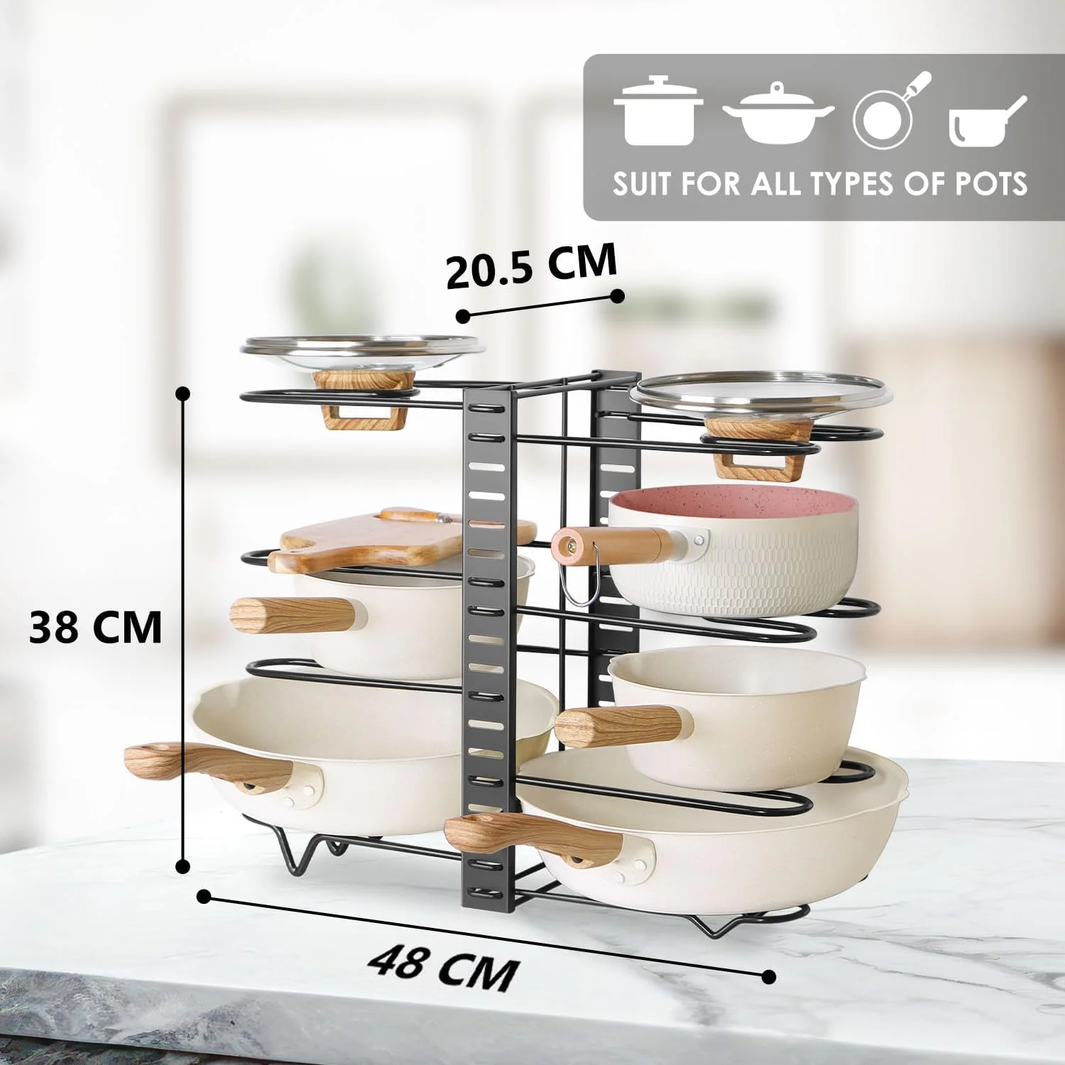 - PREMIUM MATERIAL: it is heavy-Duty Iron Build item with Non-Slip Protection. Crafted from high-strength iron, this rack supports heavy cookware without warping or wobbling. Each divider includes a rubber coating to prevent scratches and keep your pots secure and stable during use.