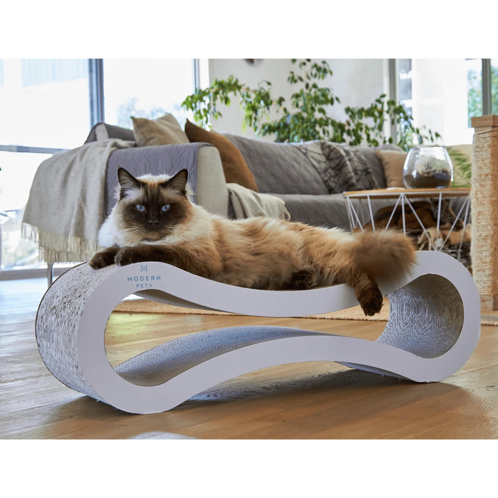 If youre tired of ugly cat scratchers taking up space in your living area, the Cat Scratcher Infinity Lounge may be the perfect solution. This functional cat scratcher will keep your kitty claws in perfect shape while providing an air of sleek modern style to your home. The infinity shape also provides a place for your cat to sleep, even if it is just a little catnap. The best thing about this cat scratcher is when the top becomes worn, simply flip it over and its brand new again!