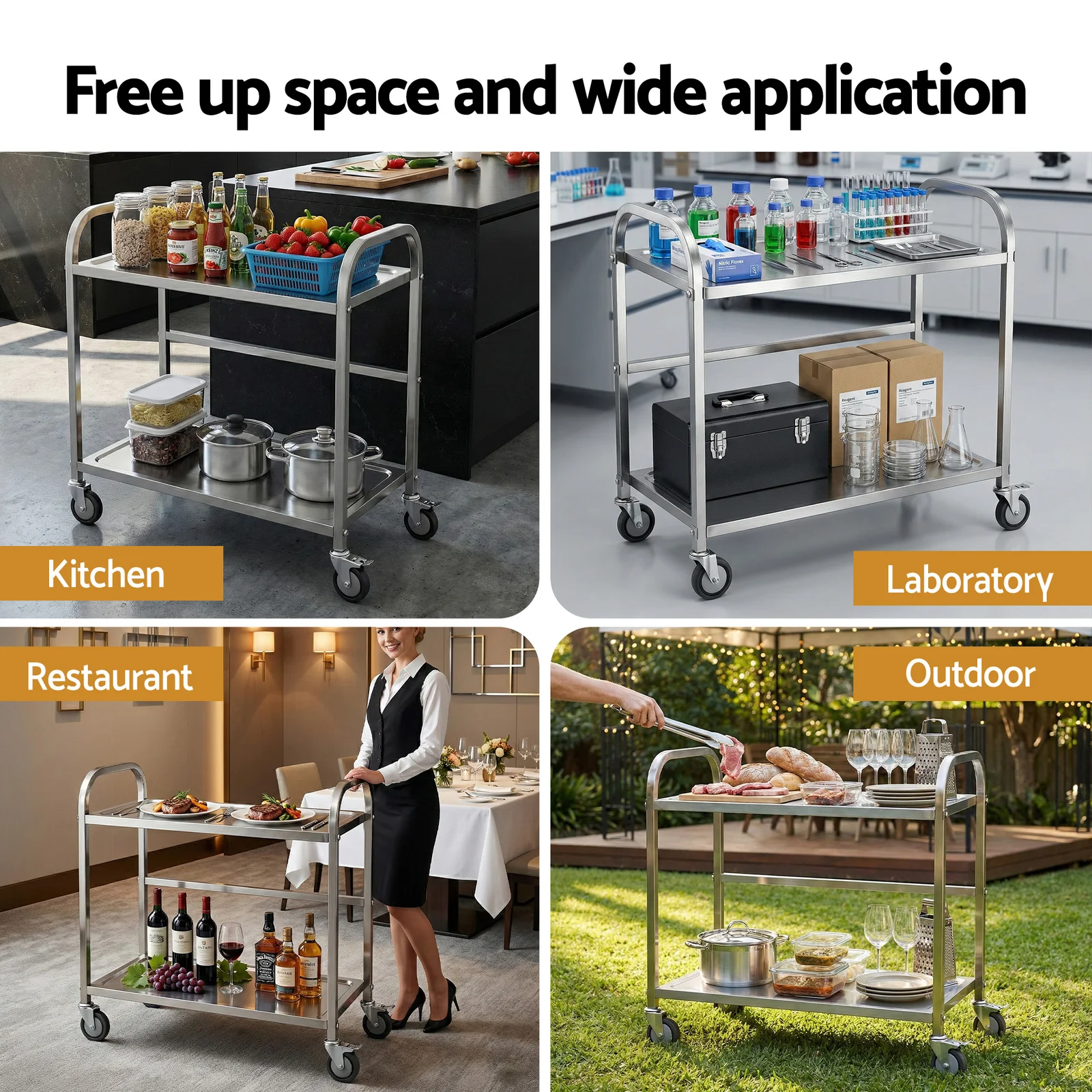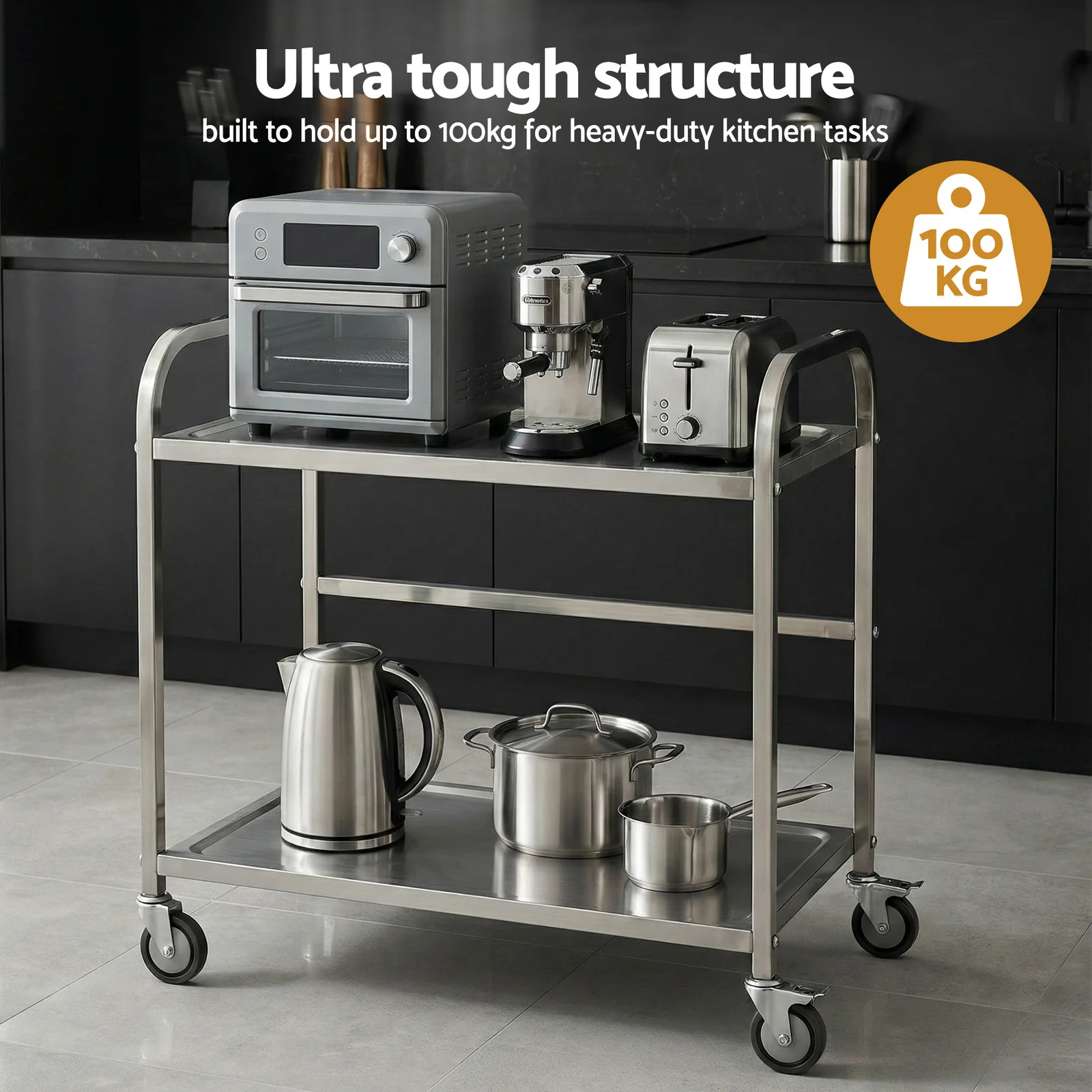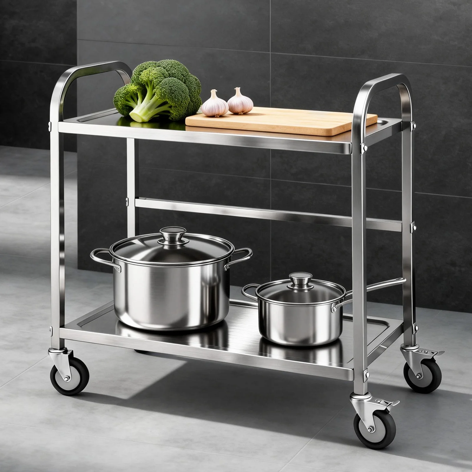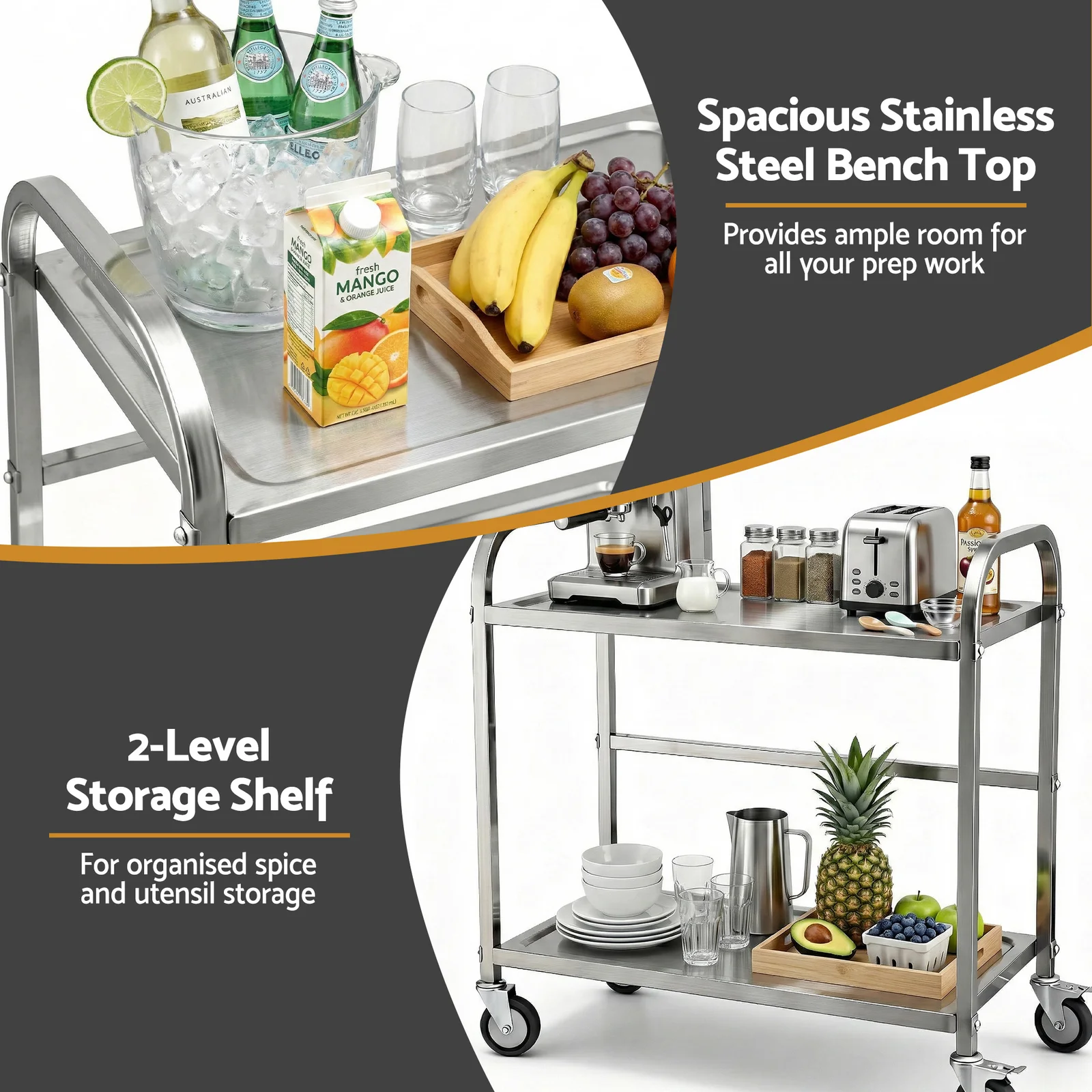 Need extra bench space that moves with you? This stainless steel kitchen trolley is your solution! Built with 201 stainless steel, it offers durable and cost-effective performance for everyday kitchen use. The 2-tier design provides flexible storage and workspace, while lockable castors let you wheel it anywhere and secure it in place.