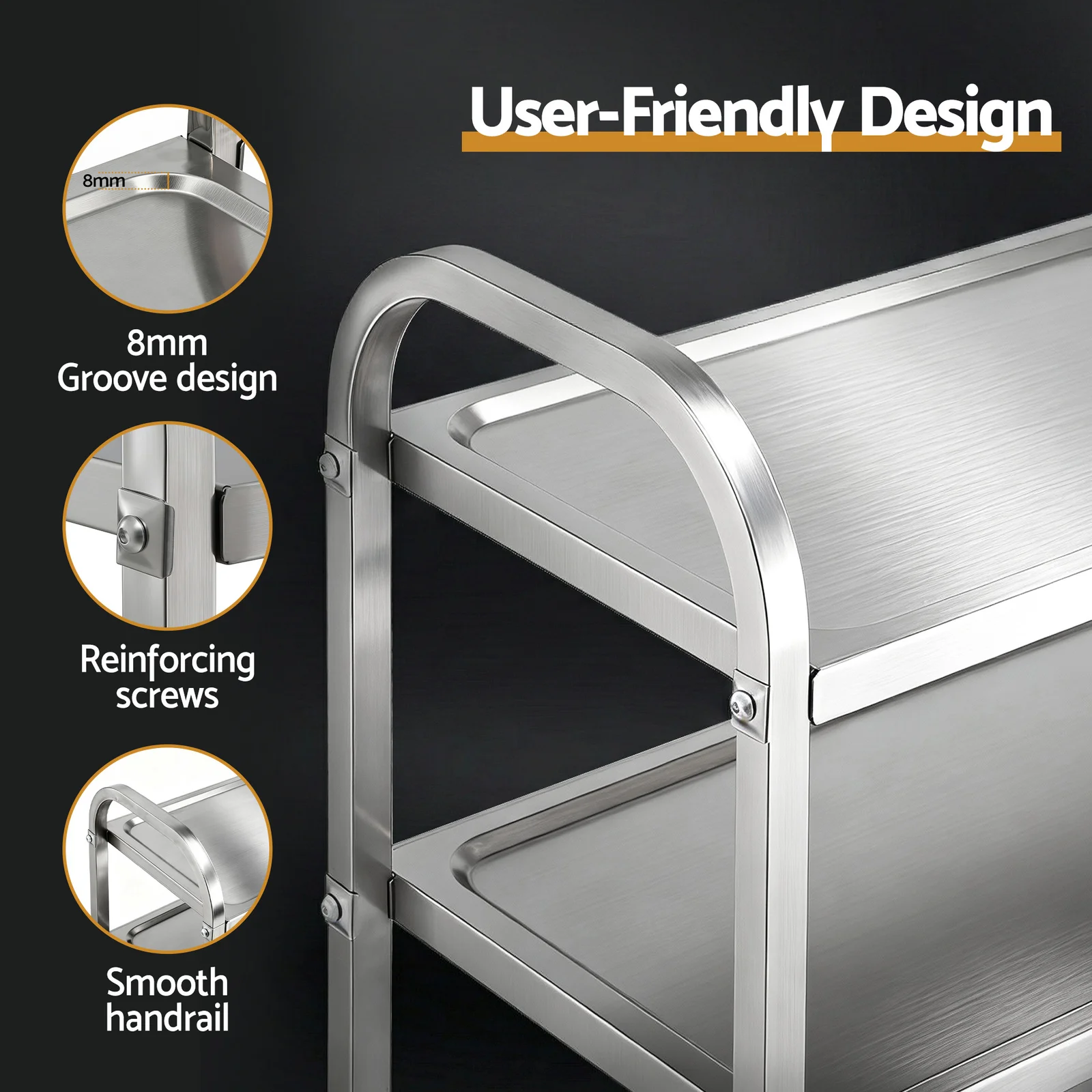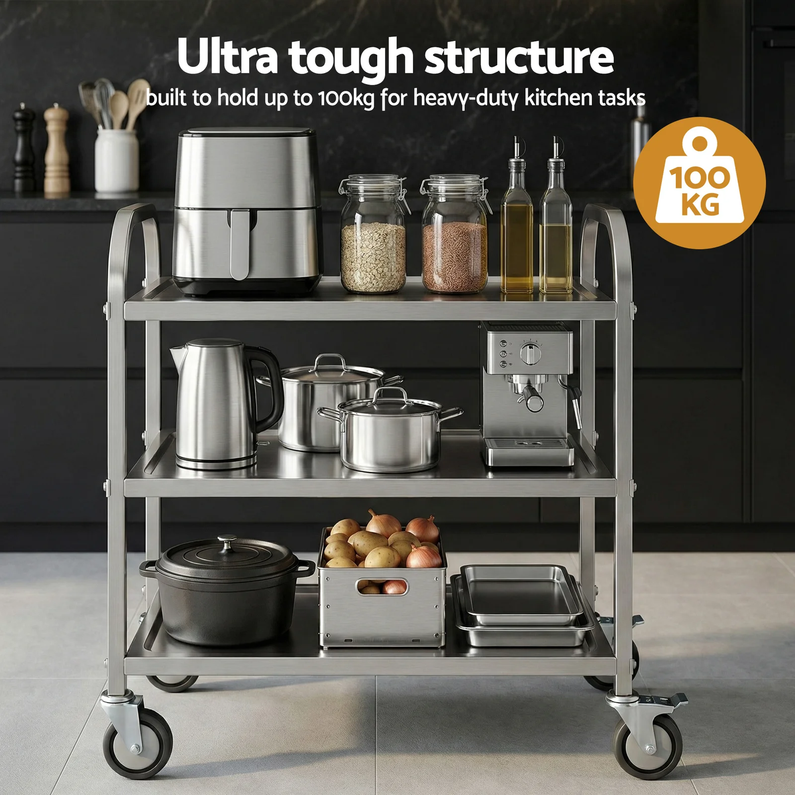 Need extra bench space that moves with you? This stainless steel kitchen trolley is your solution! Built with 201 stainless steel, it offers durable and cost-effective performance for everyday kitchen use. The 3-tier design provides flexible storage and workspace, while lockable castors let you wheel it anywhere and secure it in place.