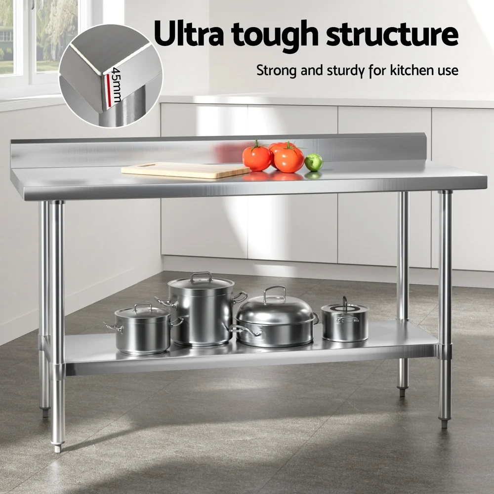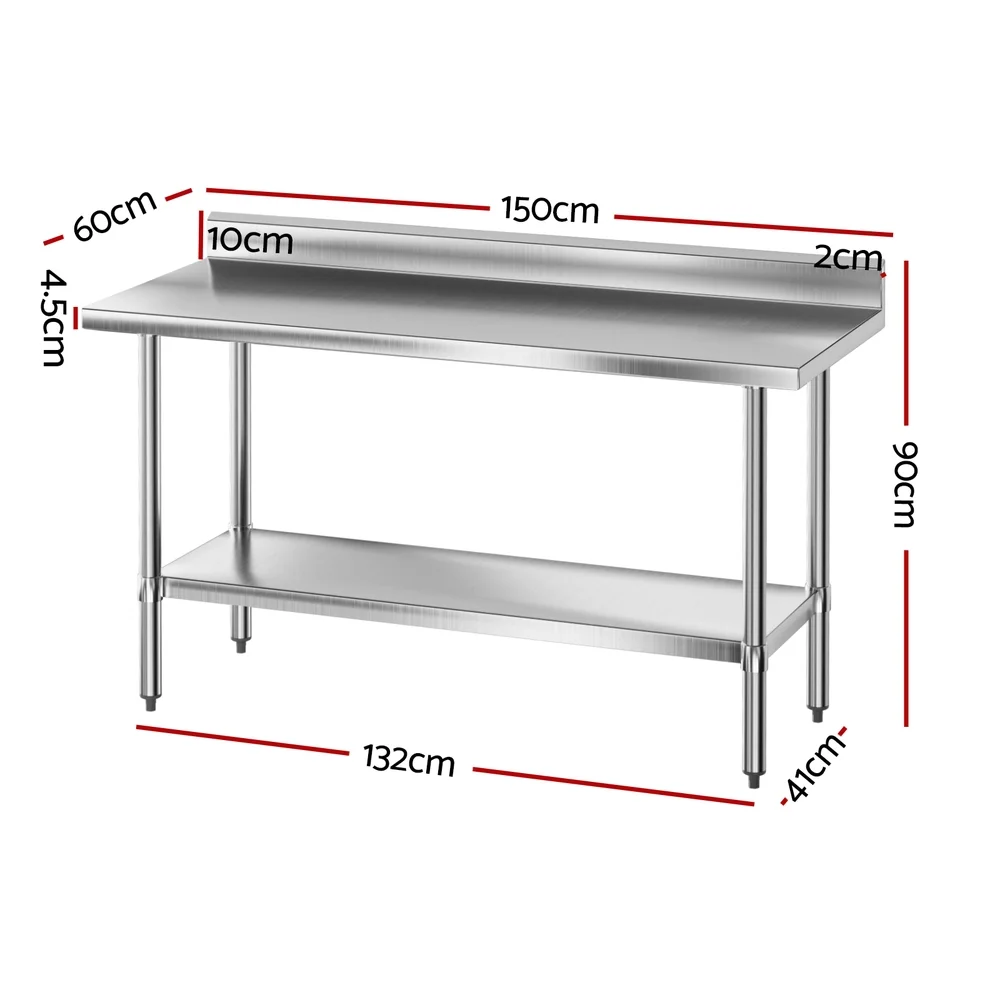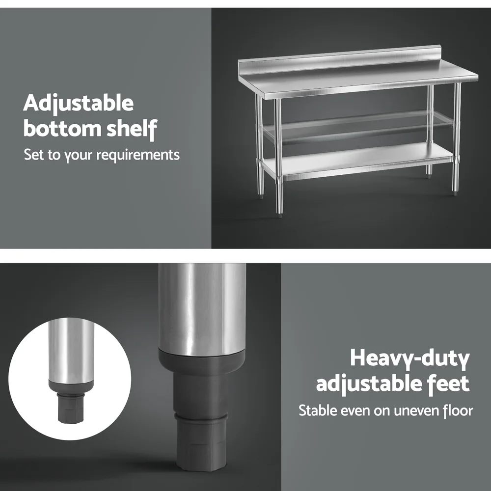 This Cefito Stainless Steel Bench is your ultimate work table solution for any commercial or home kitchen. Crafted from premium 430 food grade stainless steel, this heavy duty stainless steel table ensures durability and hygiene. The 1500mm x 600mm x 900mm size provides ample workspace, while the integrated splashback keeps your walls clean. Featuring an adjustable undershelf and adjustable plastic bullet feet, this stainless steel prep table offers versatile storage and stable leveling on any surface. Perfect as a stainless steel kitchen bench with undershelf.