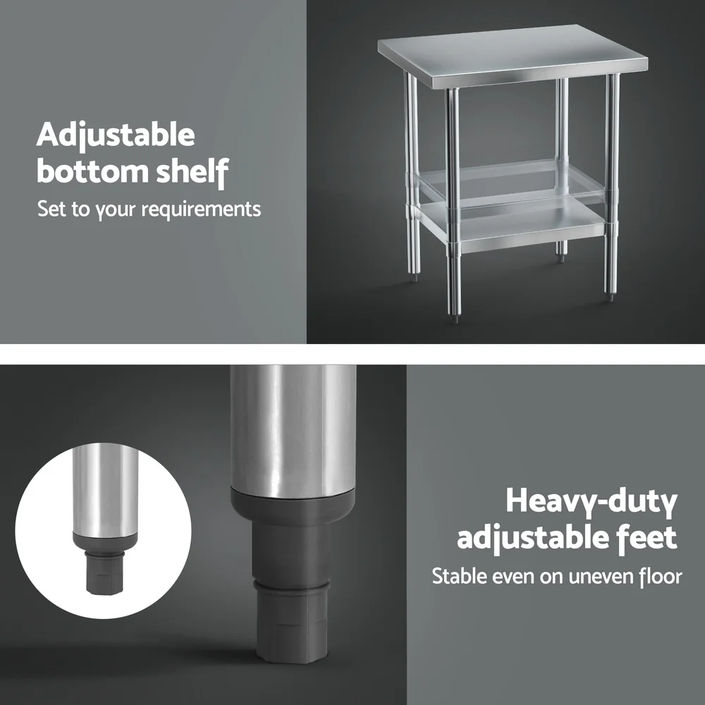 This Cefito Stainless Steel Work Table is a versatile and heavy-duty stainless steel prep table for any commercial or home kitchen. Constructed from 430 food-grade stainless steel, it ensures hygiene and durability. The upper bench boasts a 160KG load capacity, perfect for all your tasks. Featuring an adjustable undershelf for convenient storage and adjustable plastic bullet feet. This stainless steel kitchen bench with undershelf is built for reliable performance.