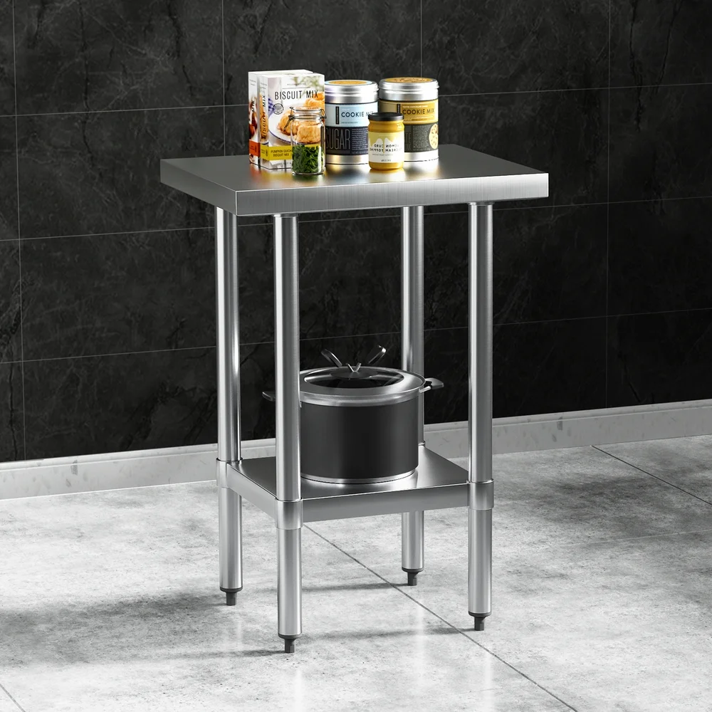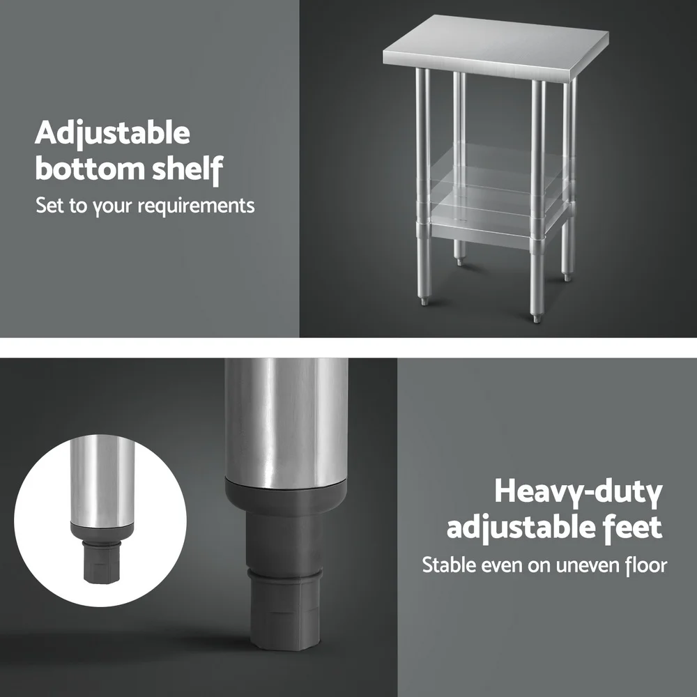 Our Stainless Steel Work Top is finished in commercial grade 430 stainless steel which makes it ideal for use in homes, cafes and restaurants. The treated bench edges provide extra safety working around the table while the adjustable bottom shelf allows you more height options for storage. Everything is held together firmly with the help of the included allen key for quick and easy installation. And if the floor is uneven, the adjustable legs can make things right with ease.