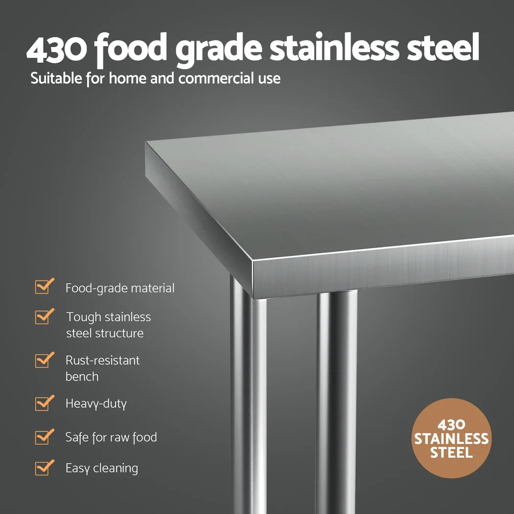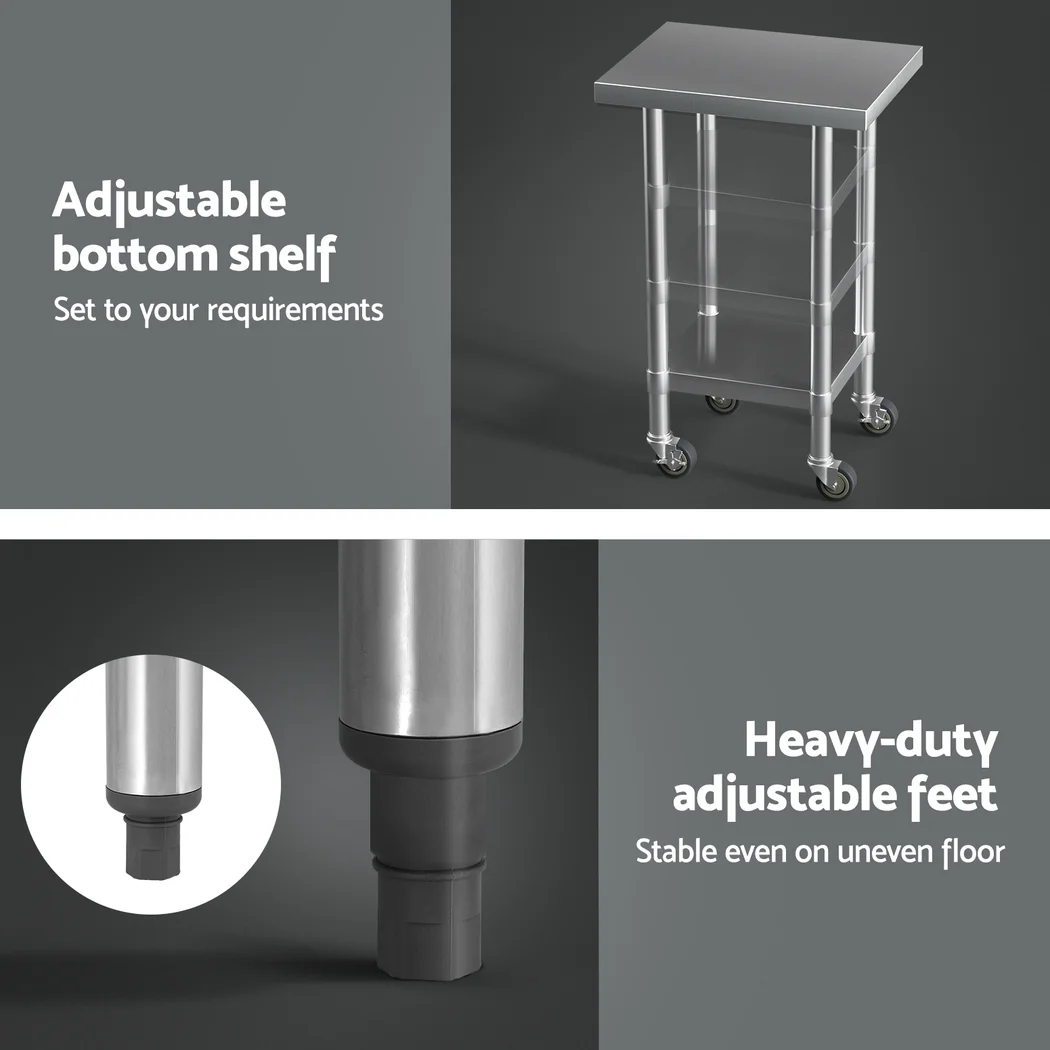 Made of 430 graded stainless steel, you can be assured that it will be a long lasting item in your kitchen. Fitted with lockable castors, stability is no longer an issue. Don't worry of tumbling bench anymore. Can be easily flat-packed for portable and on-site work, it is your first choice at all times.